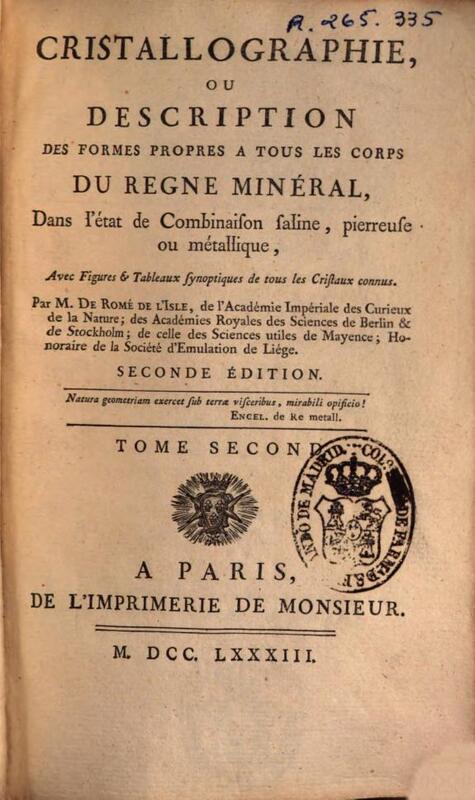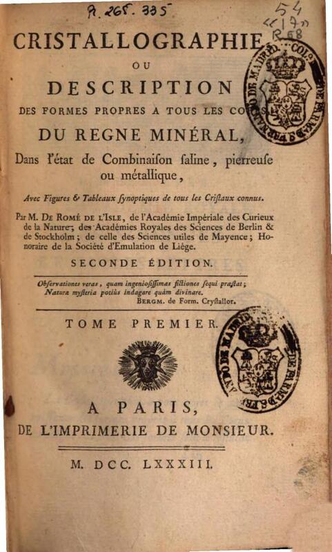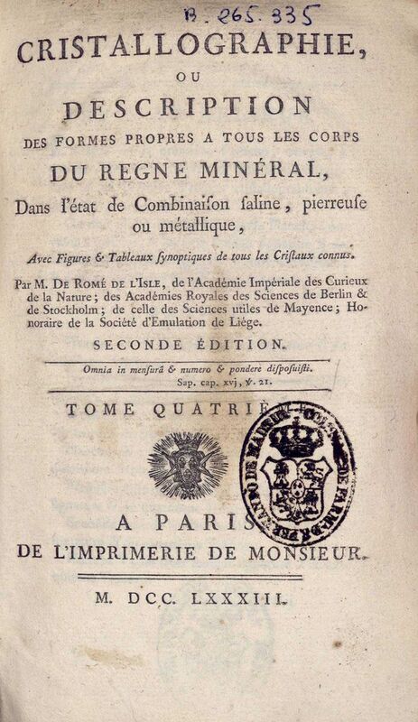 Cristallographie ou Description des formes propres à tous les corps du regne minéral dans l'état de combinaison saline, pierreuse ou métallique ...