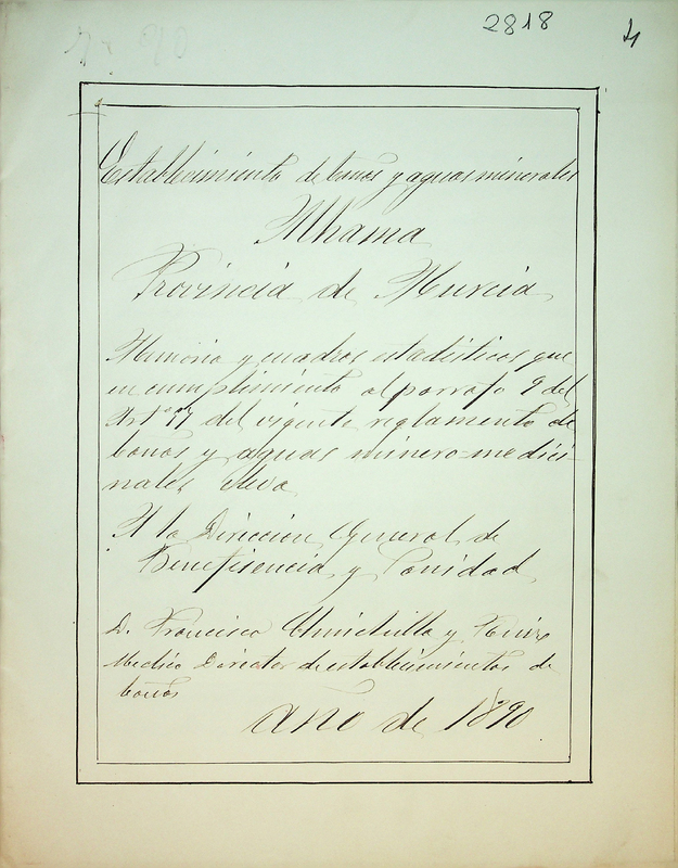 Establecimiento de baños y aguas minerales Alhama provincia de Murcia : memoria y cuadros estadisticos que en cumplimiento al parrafo 9 del art 57 del vigente reglamento de baños y aguas minero-medicinales eleva a la Direccion General de Beneficencia y Sanidad Francisco Chinchilla y Ruiz, medico director de establecimientos de baños, año de 1890