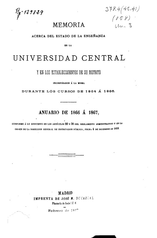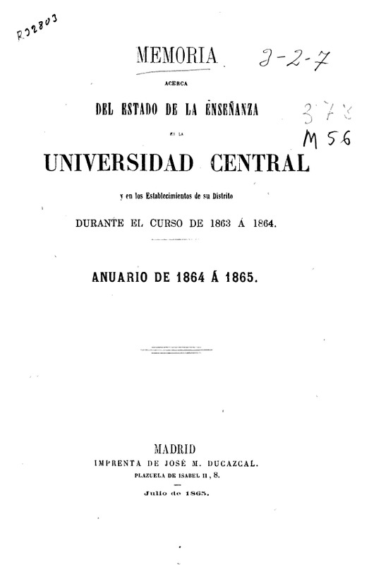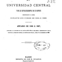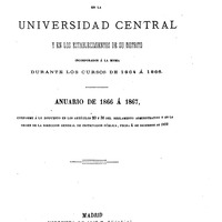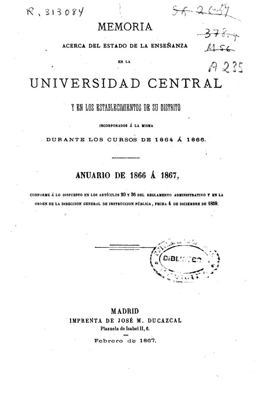 Memoria acerca del estado de la enseñanza en la Universidad Central y en los establecimientos de su distrito incorporados a la misma durante el curso de... y anuario de.. ‐ [Curso 1864-1865; Anuario1866-1867]
