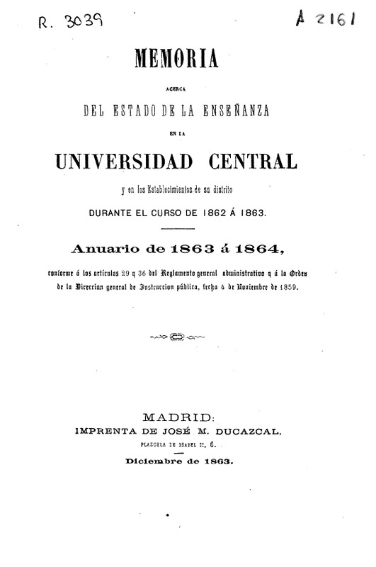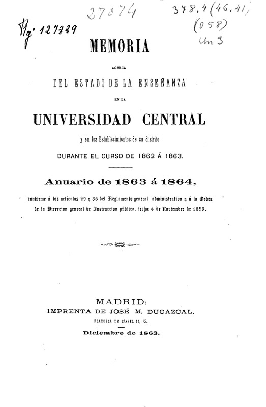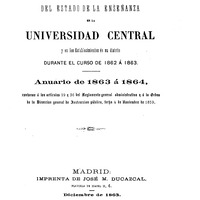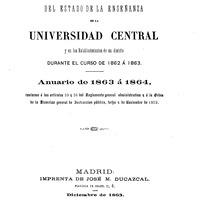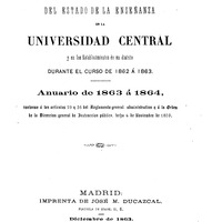 Memoria acerca del estado de la enseñanza en la Universidad Central y en los establecimientos de su distrito incorporados a la misma durante el curso de... y anuario de.. ‐ [Curso 1862-1863; Anuario 1863-64]