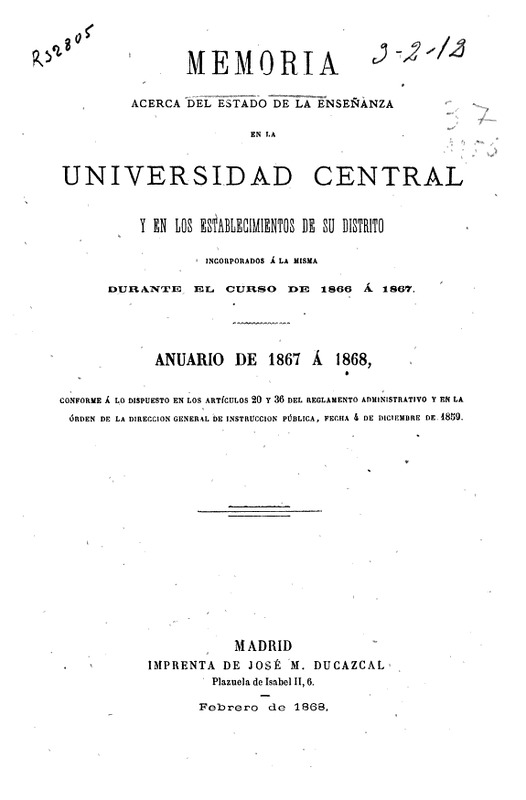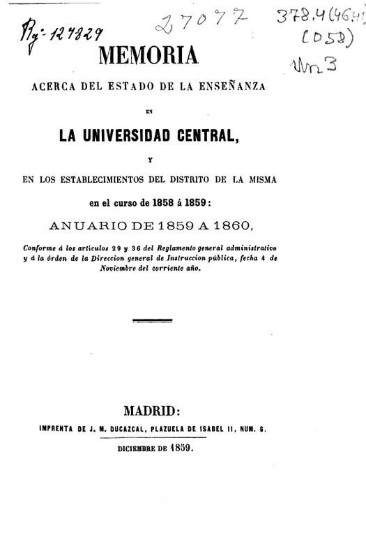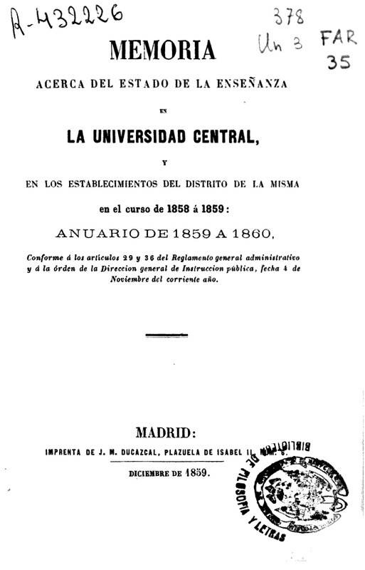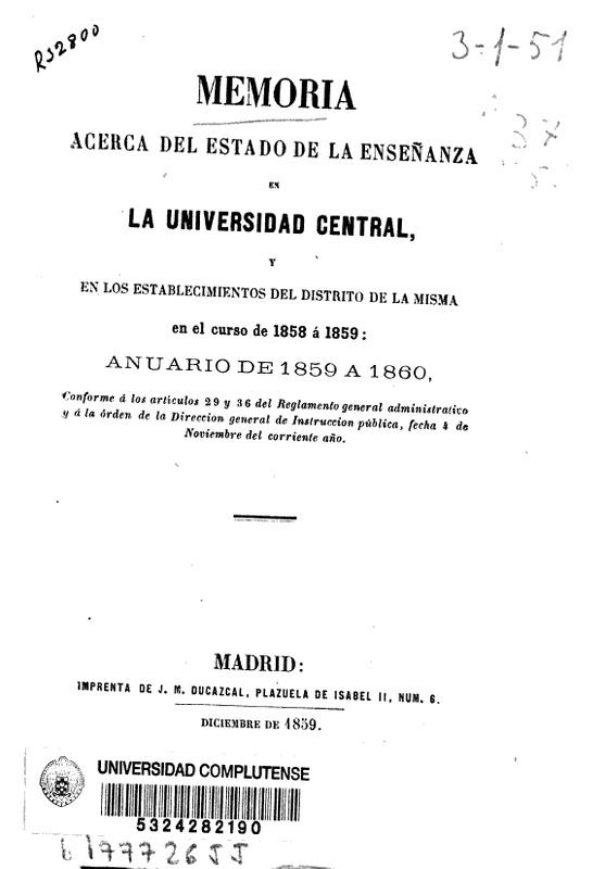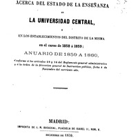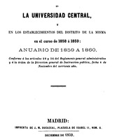 Memoria acerca del estado de la enseñanza en la Universidad Central y en los establecimientos de su distrito incorporados a la misma durante el curso de... y anuario de.. ‐ [Curso 1858-1859; Anuario 1859-1860]