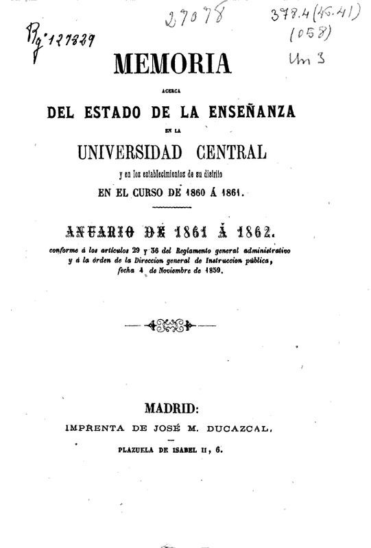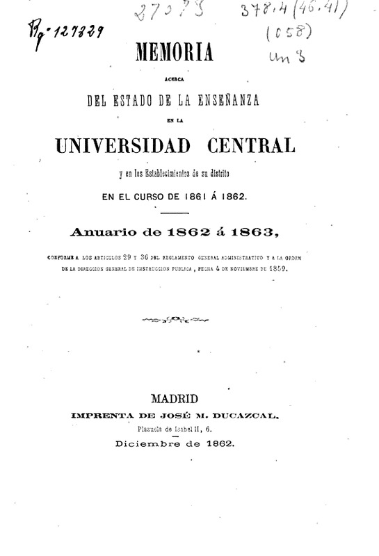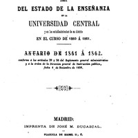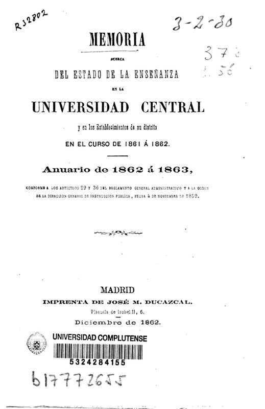 Memoria acerca del estado de la enseñanza en la Universidad Central y en los establecimientos de su distrito incorporados a la misma durante el curso de... y anuario de.. ‐ [Curso1860-1861; Anuario 1861-1862]