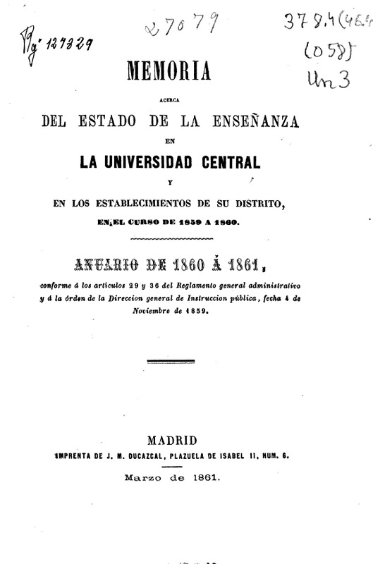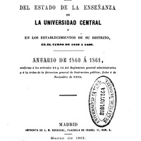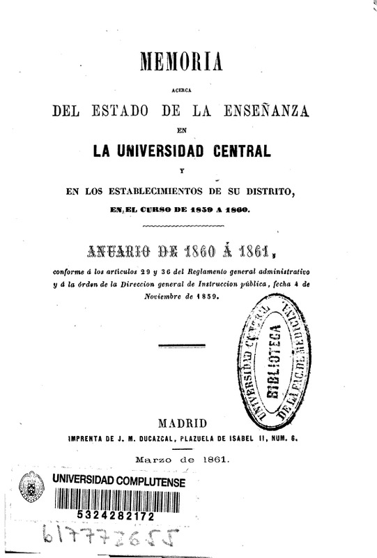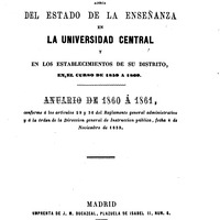 Memoria acerca del estado de la enseñanza en la Universidad Central y en los establecimientos de su distrito incorporados a la misma durante el curso de... y anuario de.. ‐ [Curso 1859-1860; Anuario 1860-61]