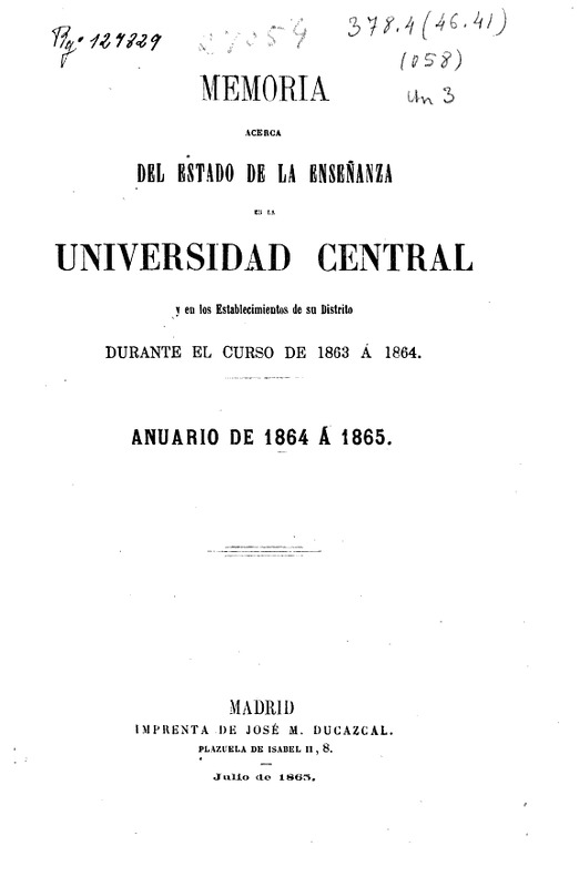 Memoria acerca del estado de la enseñanza en la Universidad Central y en los establecimientos de su distrito incorporados a la misma durante el curso de... y anuario de.. ‐ [Curso 1863-1864; Anuario 1864-1865]