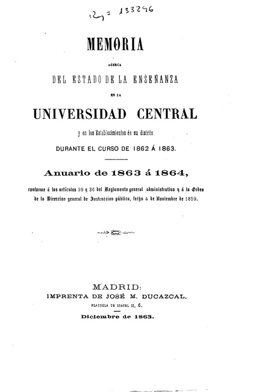 Memoria acerca del estado de la enseñanza en la Universidad Central y en los establecimientos de su distrito incorporados a la misma durante el curso de... y anuario de.. ‐ [Curso 1862-1863]