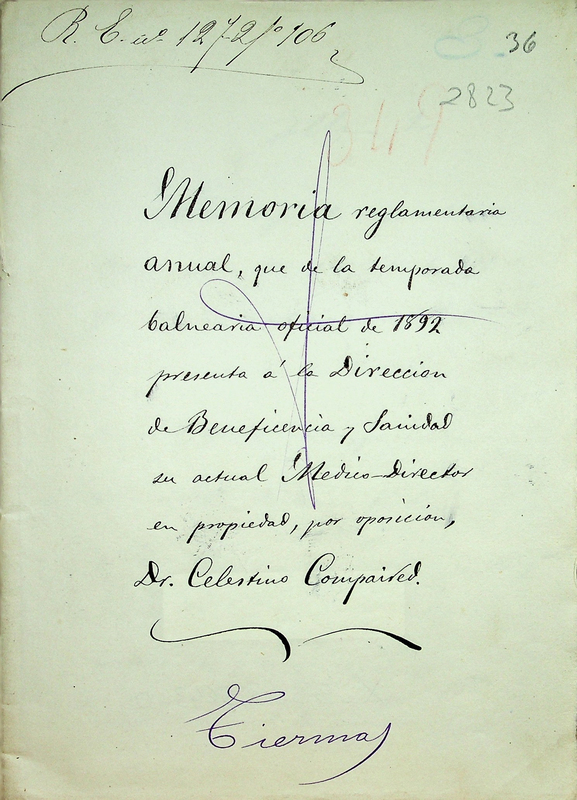 Memoria reglamentaria anual, que de la temporada balnearia oficial de 1892 presenta á la Direccion de Beneficencia y Sanidad su actual médico-director en propiedad, por oposicion, Dr. Celestino Compaired : Tiermas