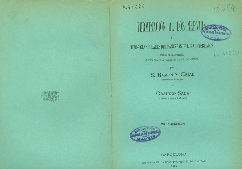 Terminación de los nervios y tubos glandulares del páncreas de los vertebrados : trabajo del Laboratorio de Histología de la Facultad de Medicina de Barcelona