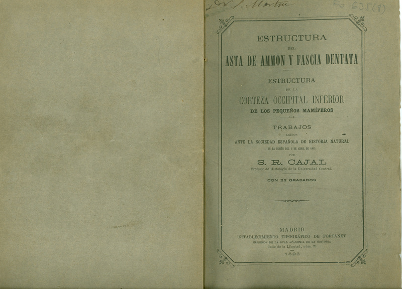 Estructura del asta de Ammon y fascia dentata : trabajos leidos ante la Sociedad Española de Historia Natural ... ; Estructura de la corteza occipital inferior de los pequeños mamíferos