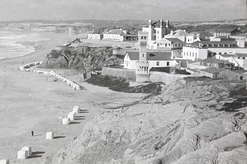 [Hombres en la playa cargando mercancías en caballos en una playa de Ifni]