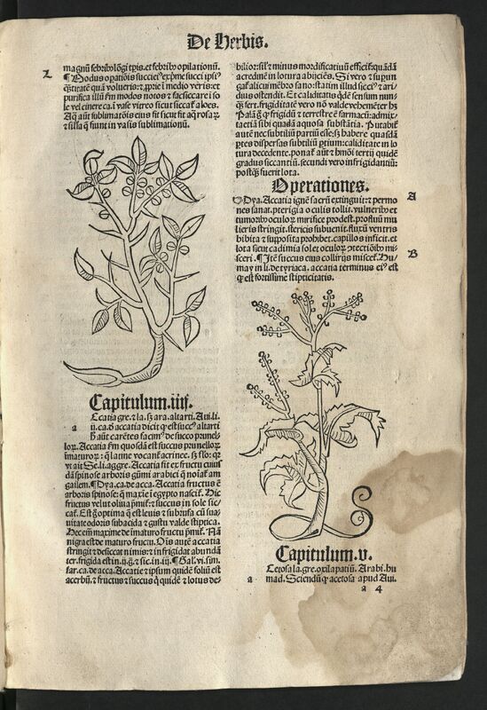 - Sólo está la primera parte, De herbis. Falta la primera hoja (a1). Sello del Colegio de San Carlos. Encuadernación de pergamino.