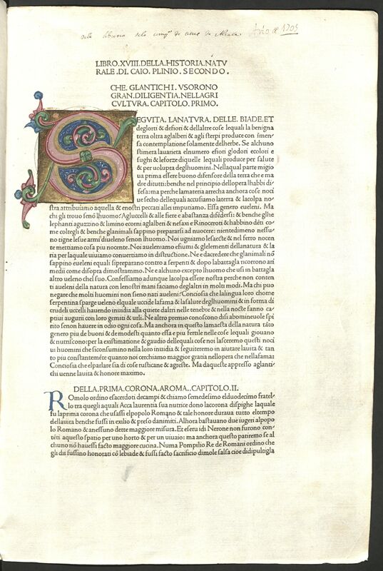 - Las iniciales de cada uno de los 37 libros están miniadas, con oro y varios colores. Faltan las hojas correspondiewntes al principio de los siguientes libros (cada uno con su correspondiente inicial): II, IV, V, VI, VIII, XXIIII, XXV, XXIX, XXXIII y XXXIIII. Anotaciones mss. en los márgenes. Ex-libris ms. del Colegio de la Compañía de Jesús de Alcalá. Encuadernado en 2 v. Encuadernación de pergamino