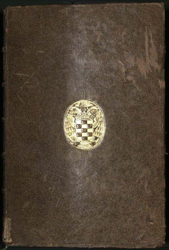 - Ex-libris ms. del Colegio Mayor de Alcalá. Encuadernación de pasta con super-libros de la Universidad de Alcalá.