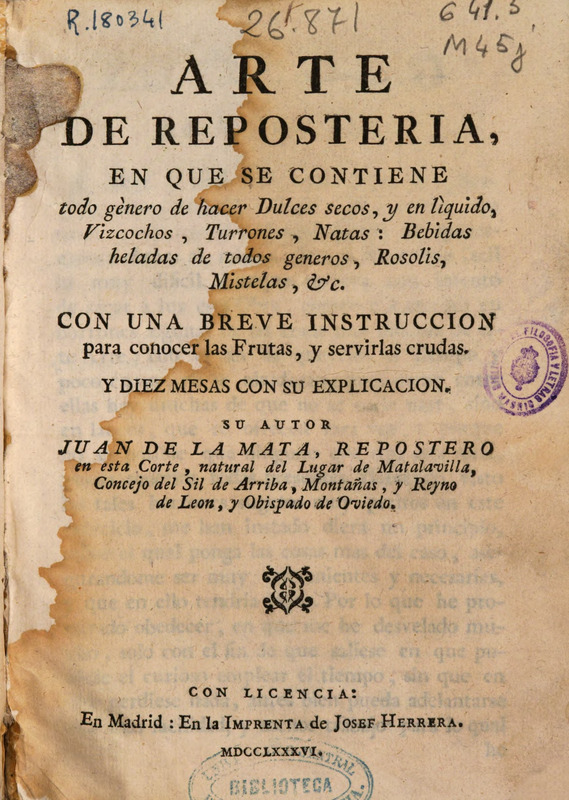 Arte de reposteria : en que se contiene todo gènero de hacer dulces secos y en lìquido, vizcochos, turrones, natas, bebidas heladas de todos generos, rosolis, mistelas [et]c. Con una breve instruccion para conocer las frutas y servirlas crudas. Y diez mesas con su explicacion