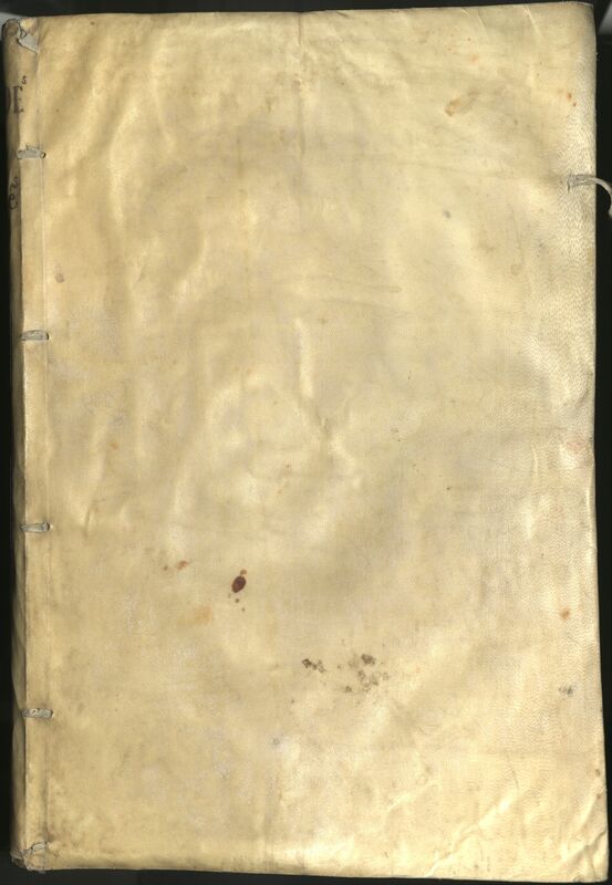- Ex-libris ms. del Colegio Mayor de Alcalá. Iniciales y calderones a mano en tinta azul y roja. Capitales en varios colores. Encuadernación de pergamino