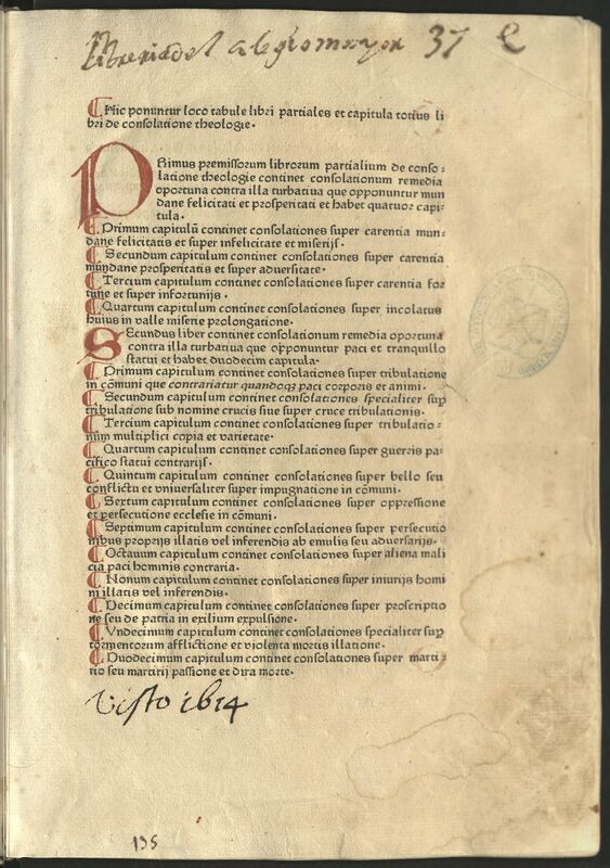 - Ex-libris ms. del Colegio Mayor de Alcalá. Falta la última hoja. Algunas anotaciones mss. Iniciales y calderones a mano en tinta roja. Encuadernación de pergamino.