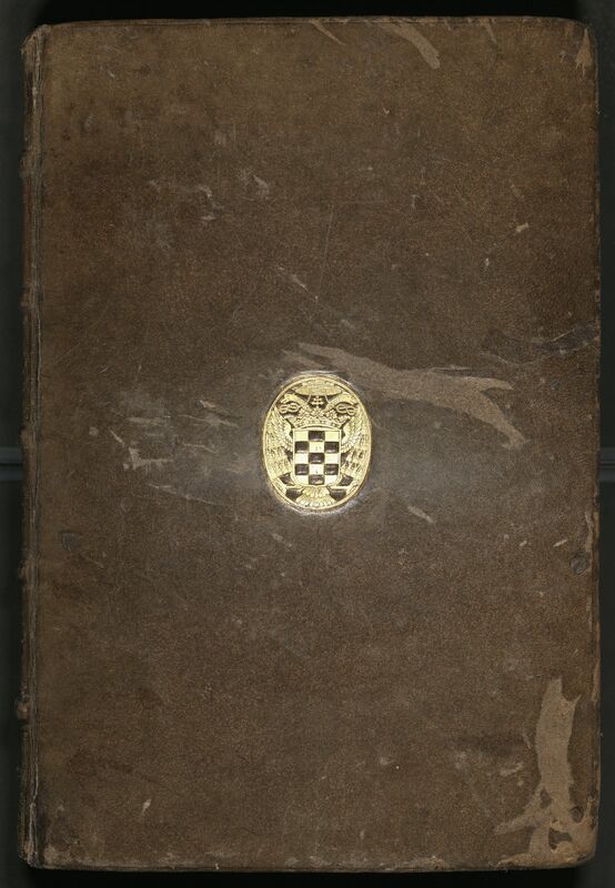 - Ex-libris ms. del Colegio Mayor de Alcalá. Encuadernación de pasta con super-libris de la Universidad de Alcalá.