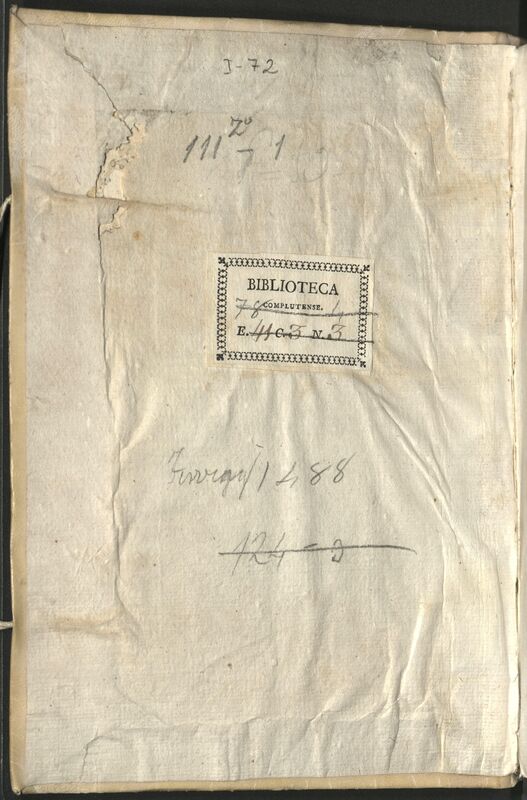 - Ex-libris ms. del Colegio Mayor de Alcalá. Iniciales y calderones a mano en tinta azul y roja. Encuadernación de pergamino.