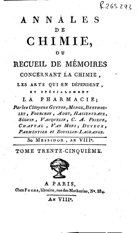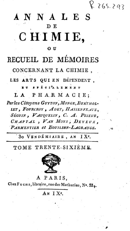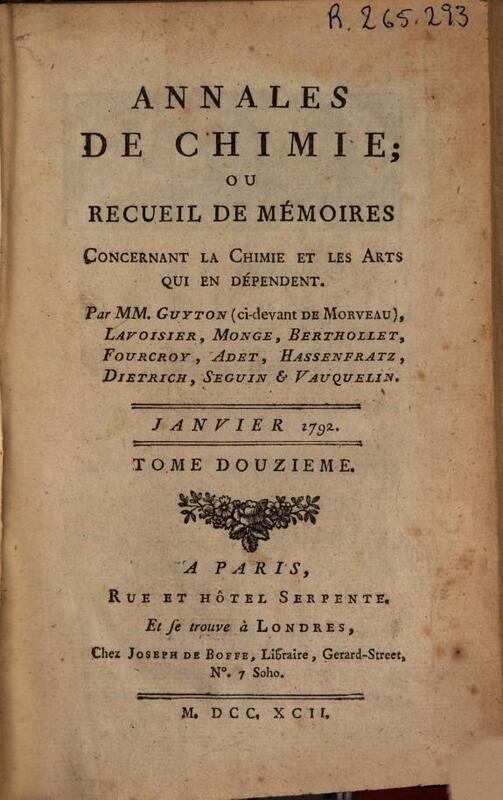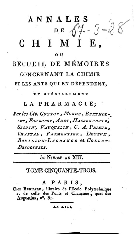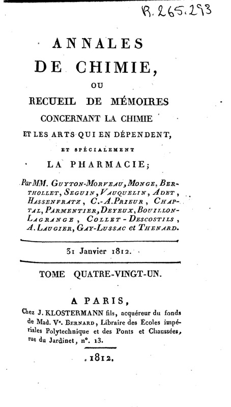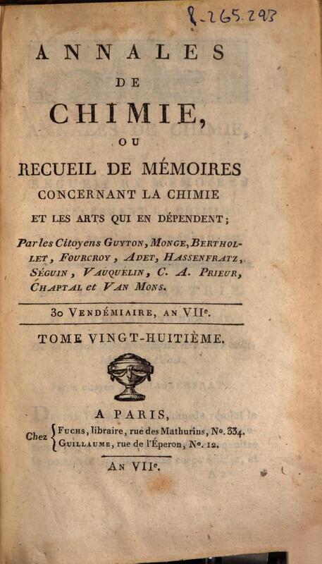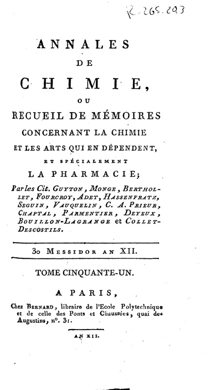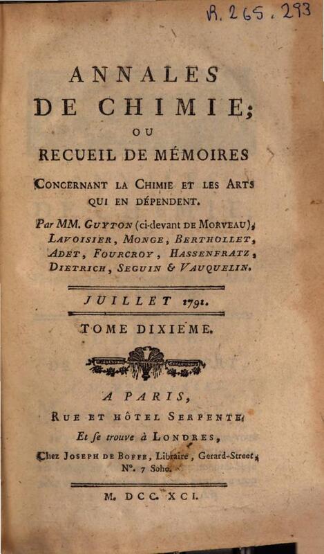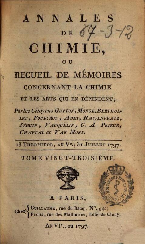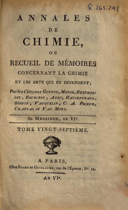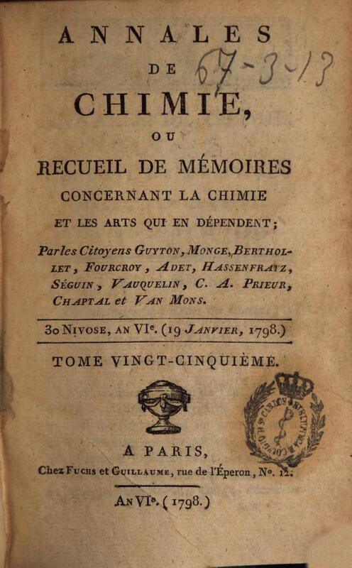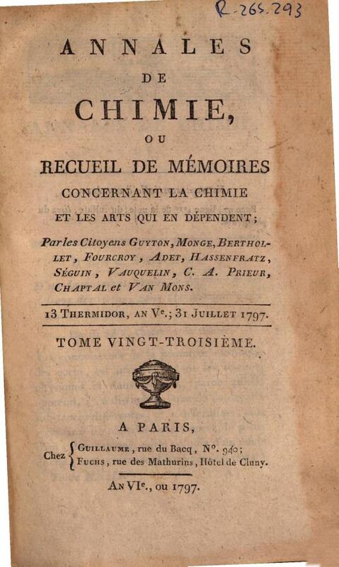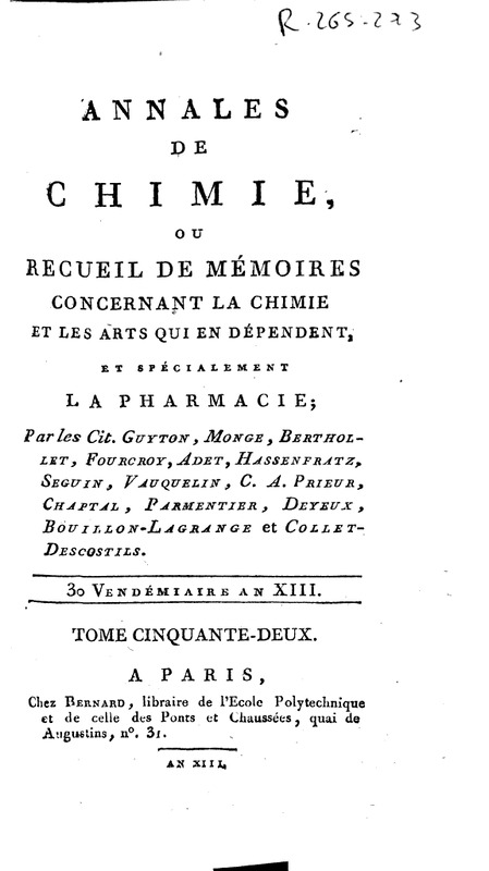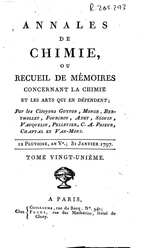 - Annales de chimie ou Recueil de mémoires concernant la chimie et les arts qui en dépendent