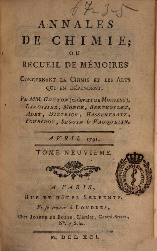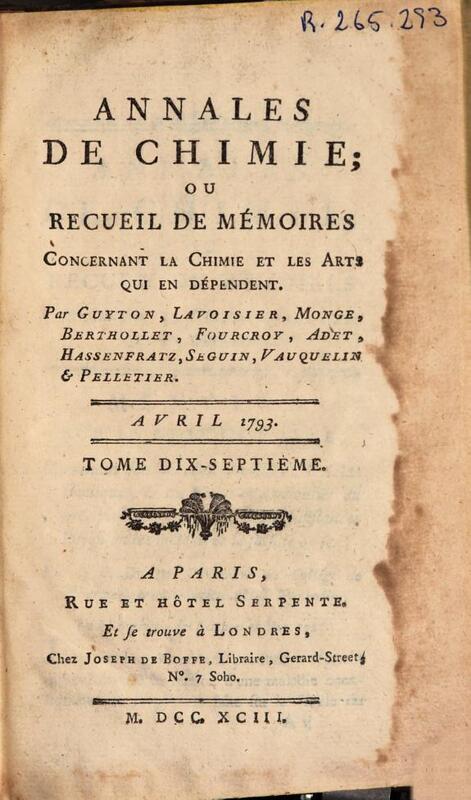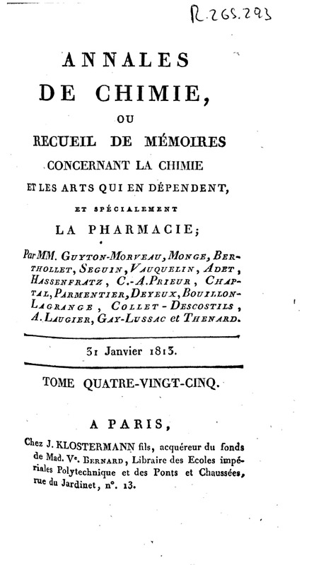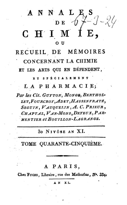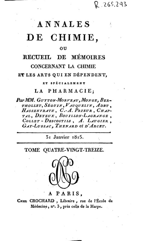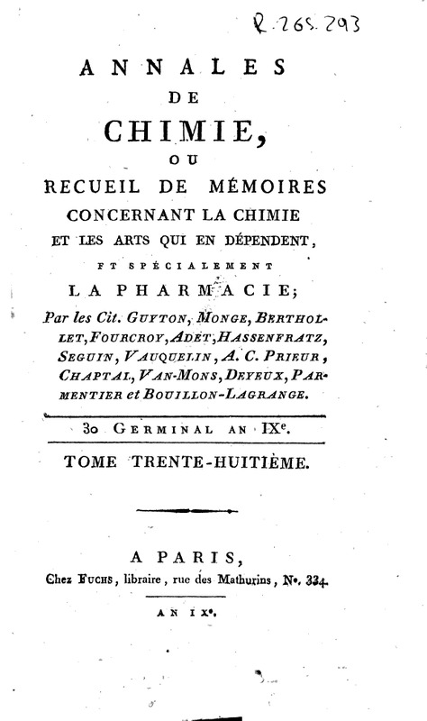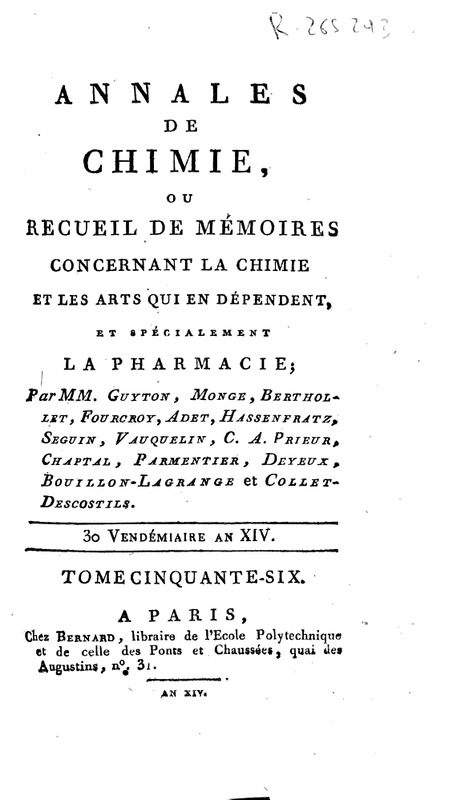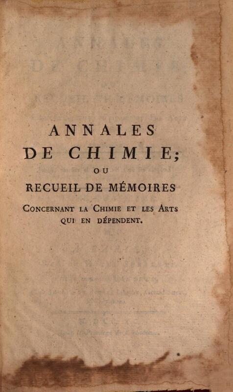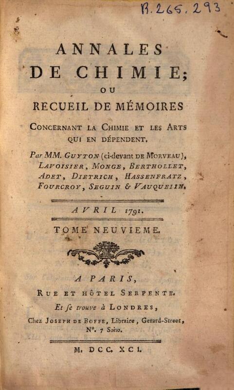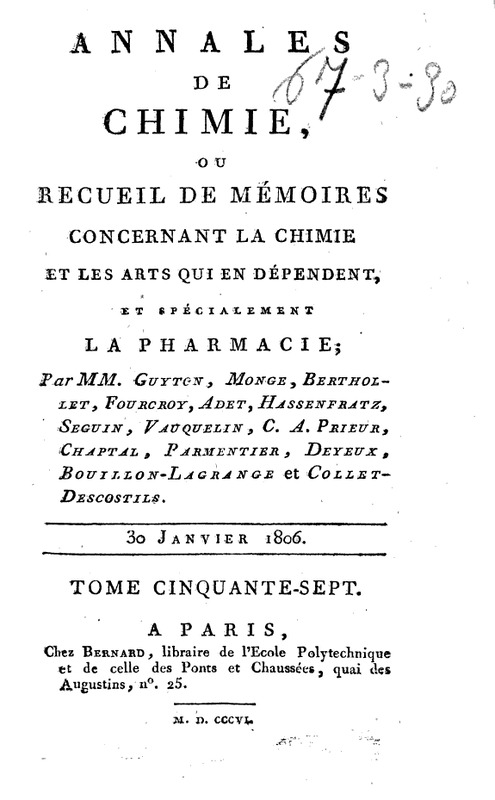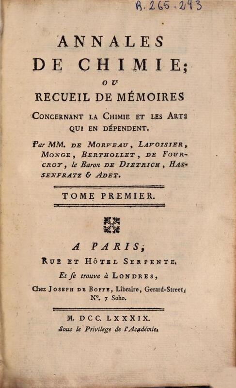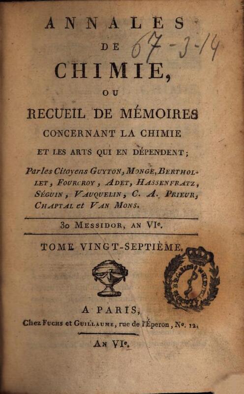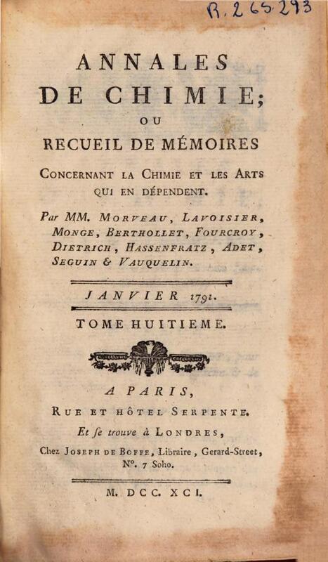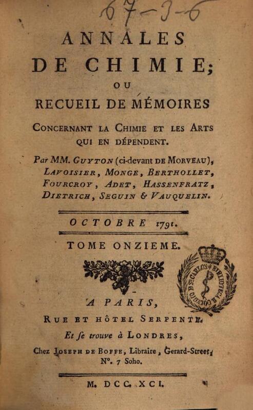 - Annales de chimie ou Recueil de mémoires concernant la chimie et les arts qui en dépendent