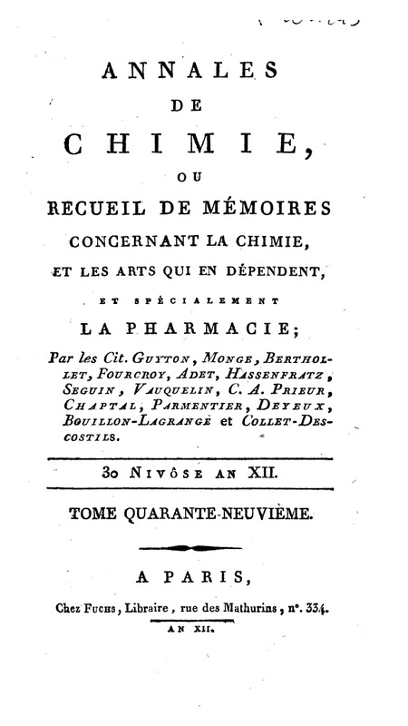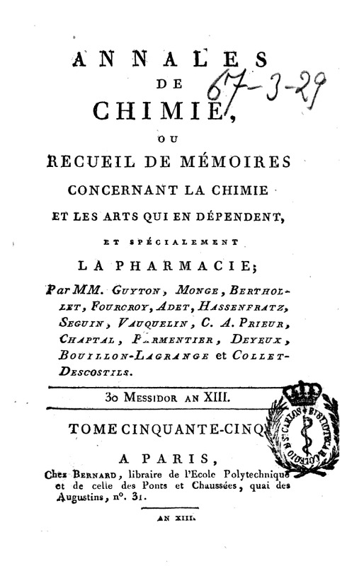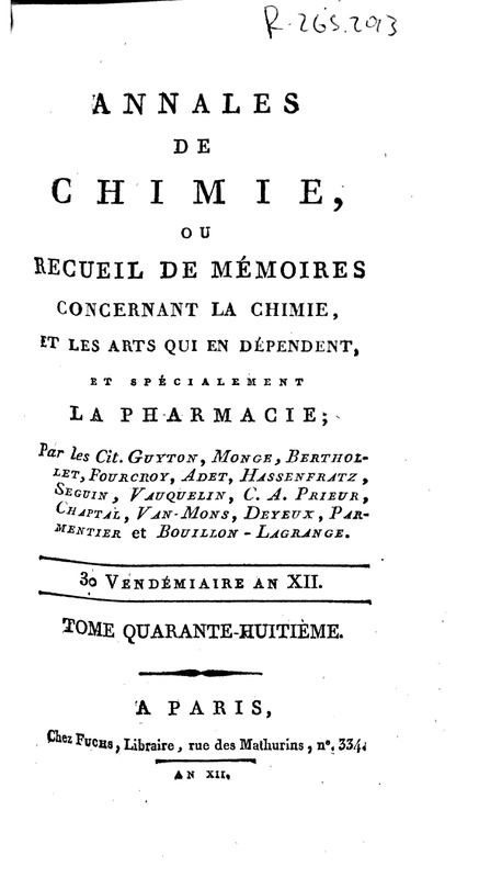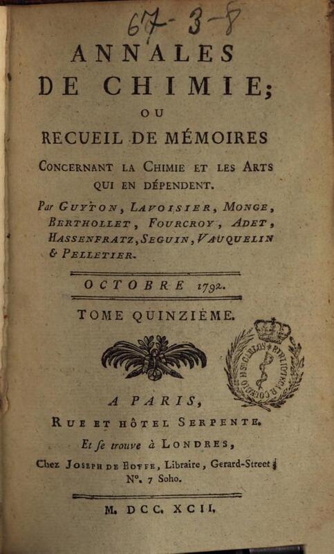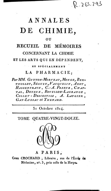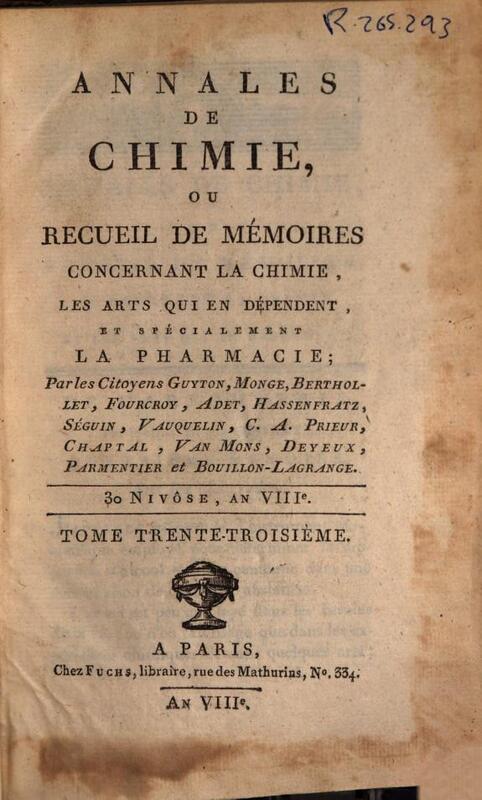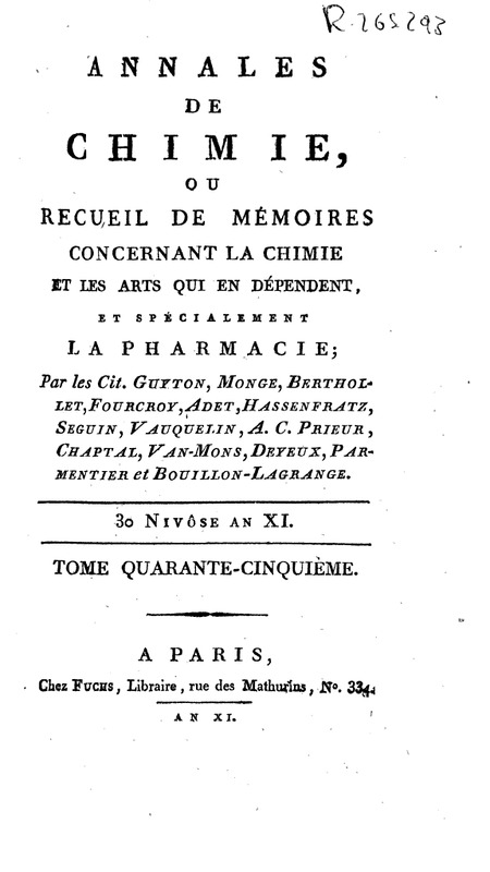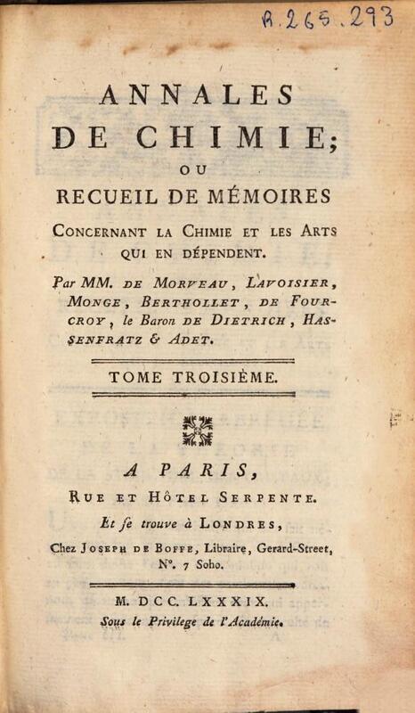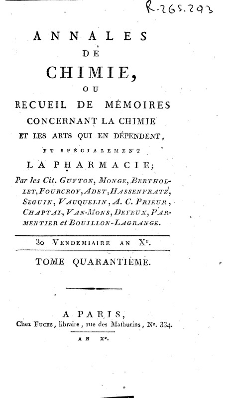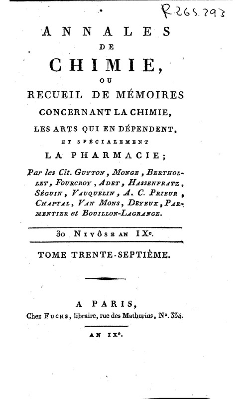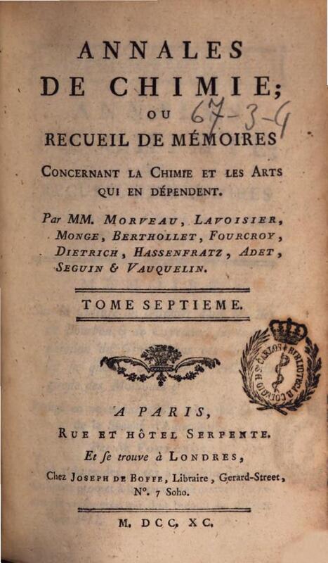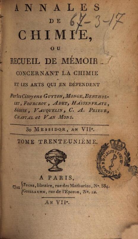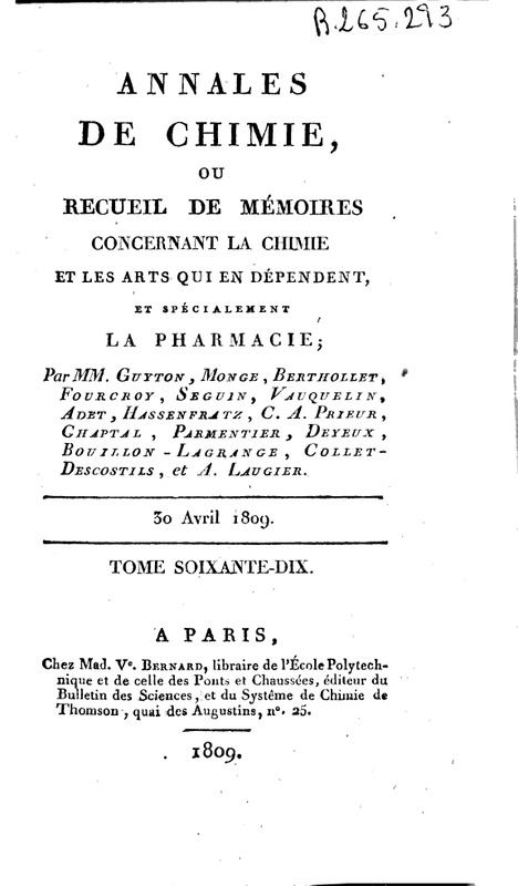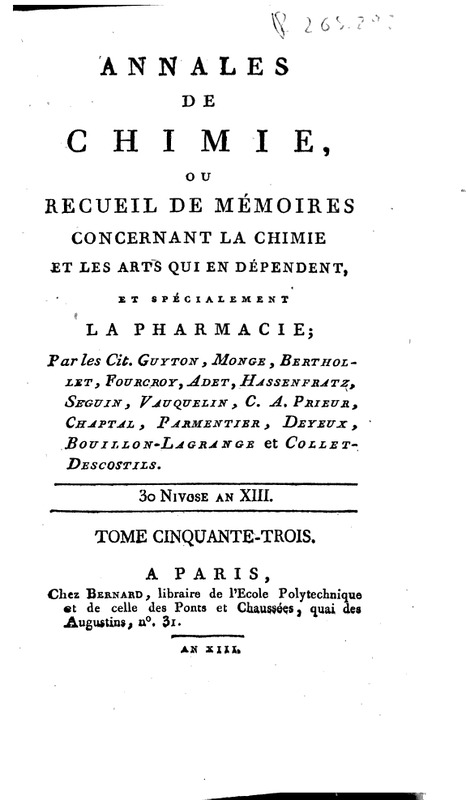 - Annales de chimie ou Recueil de mémoires concernant la chimie et les arts qui en dépendent