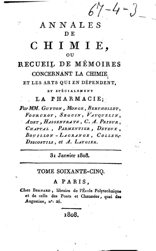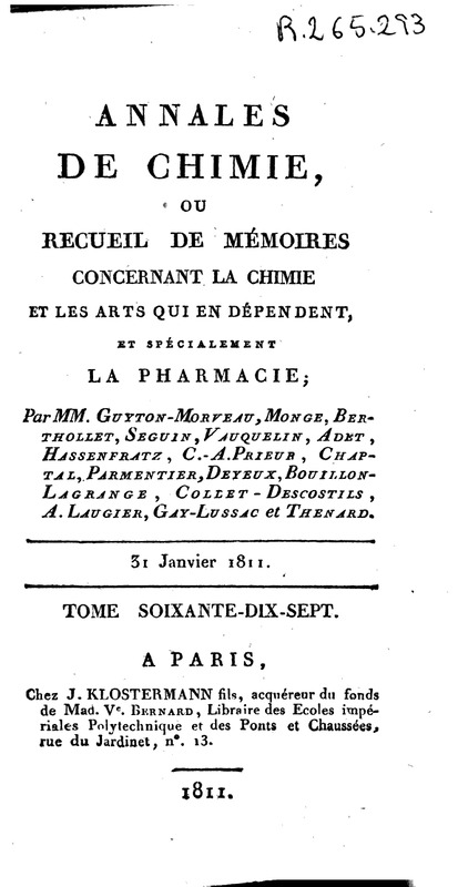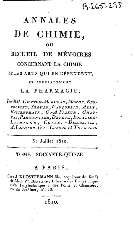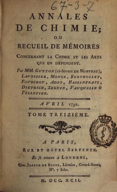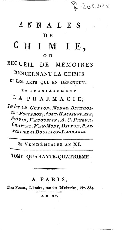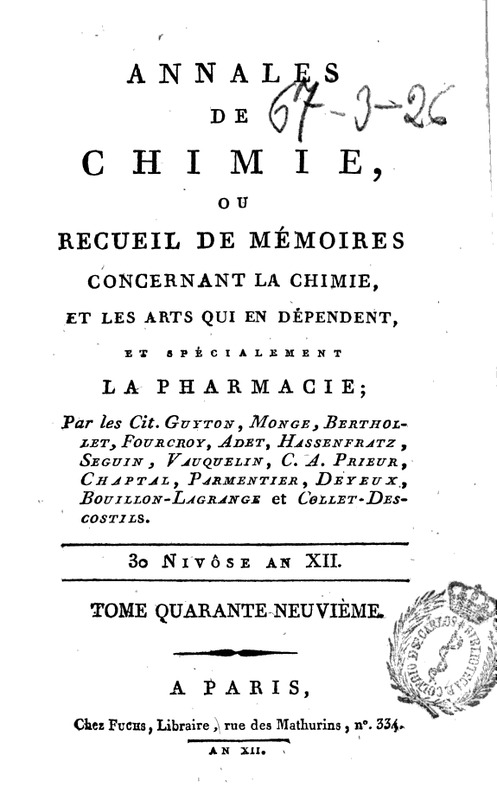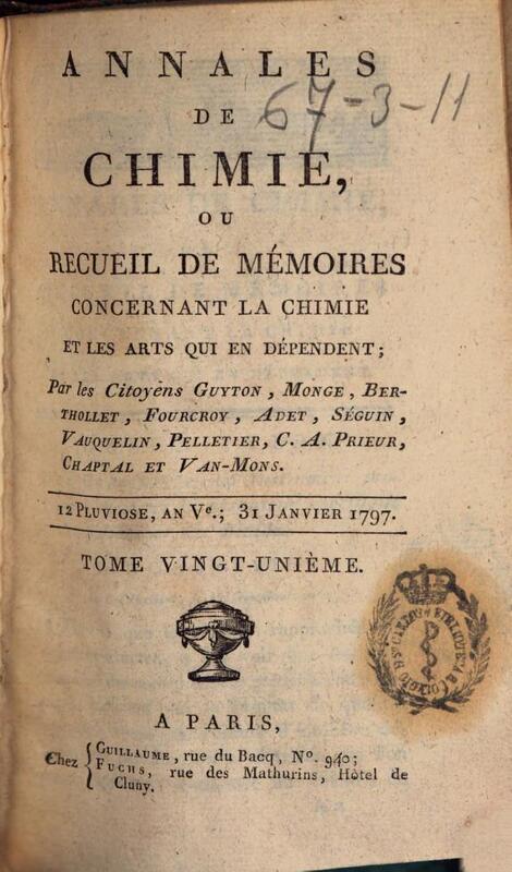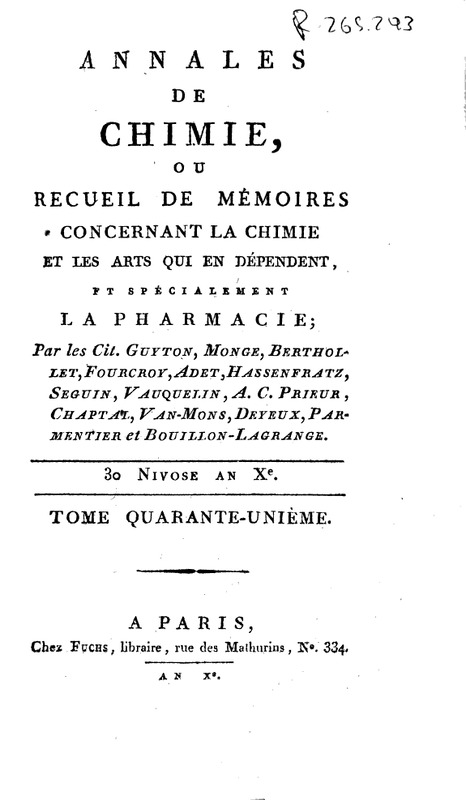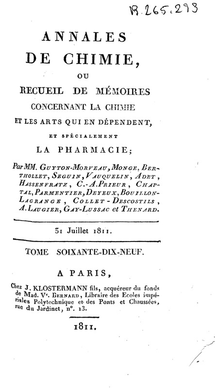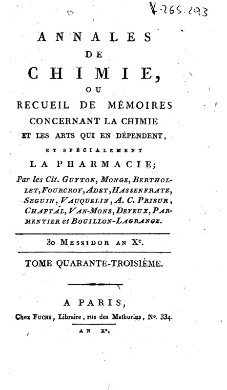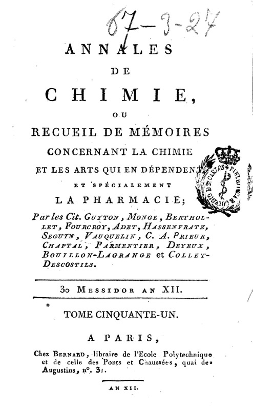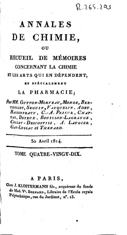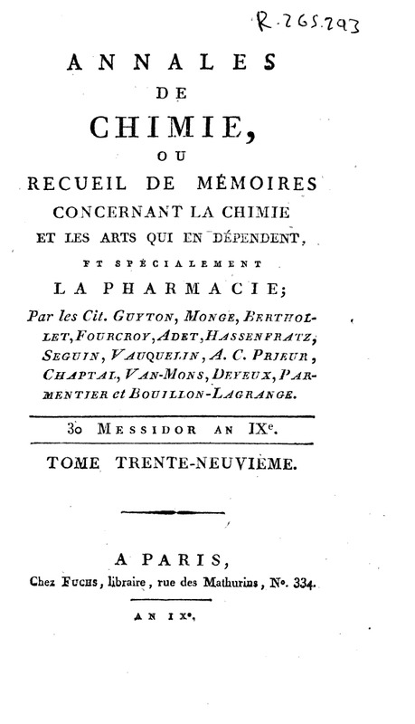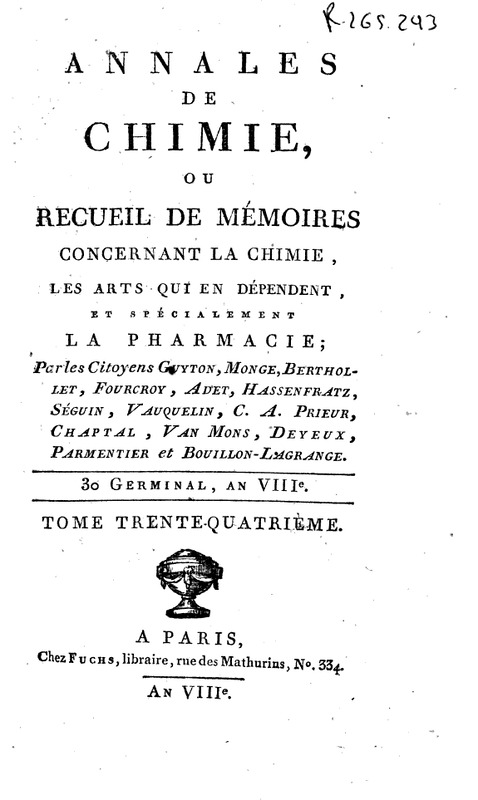 - Annales de chimie ou Recueil de mémoires concernant la chimie et les arts qui en dépendent