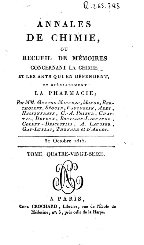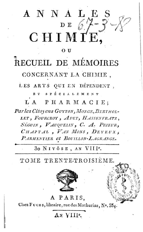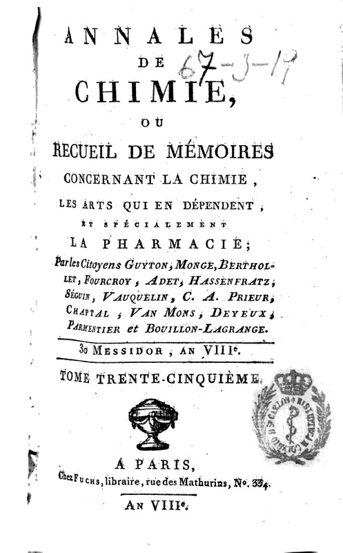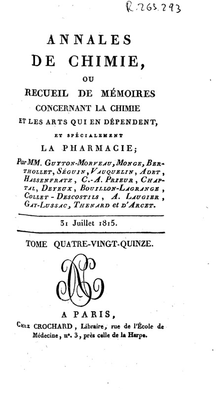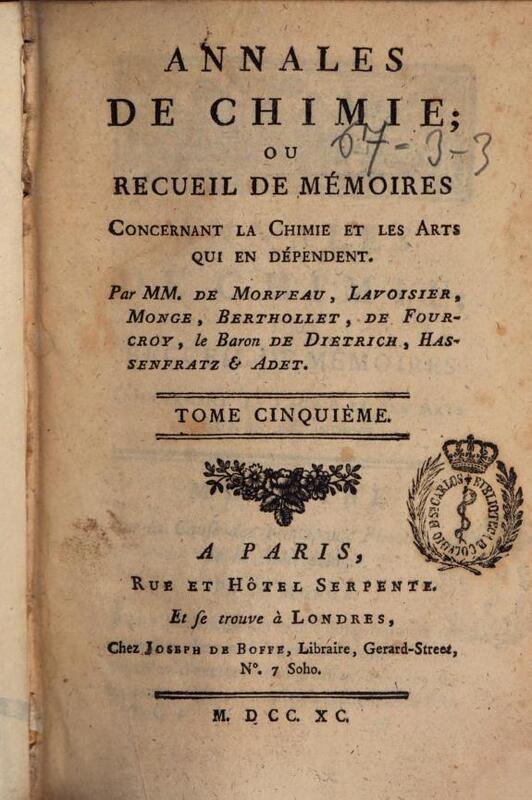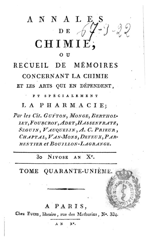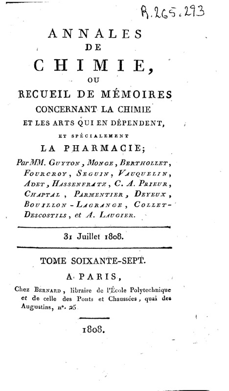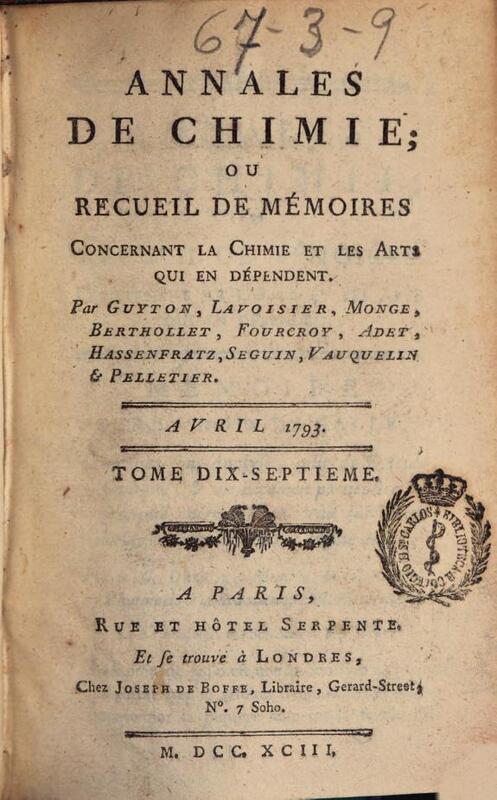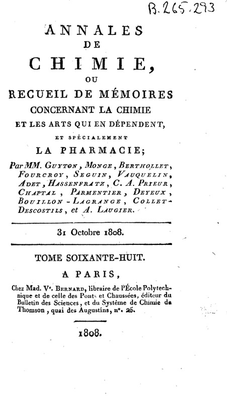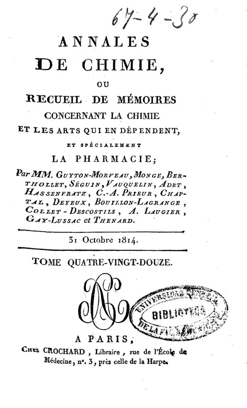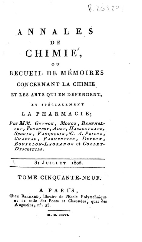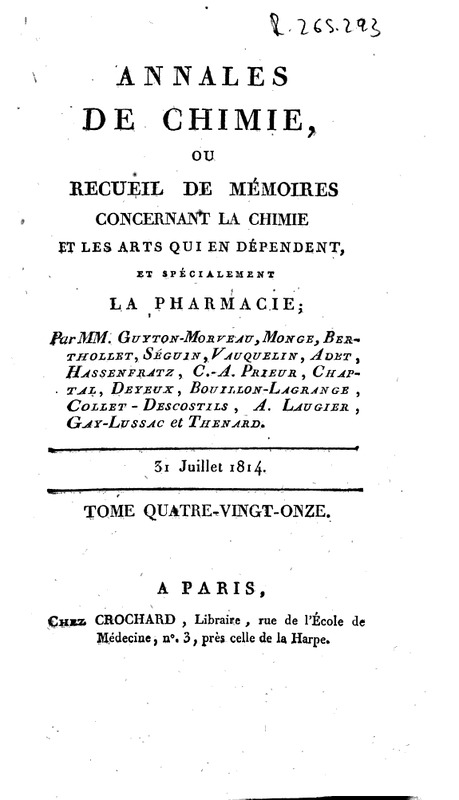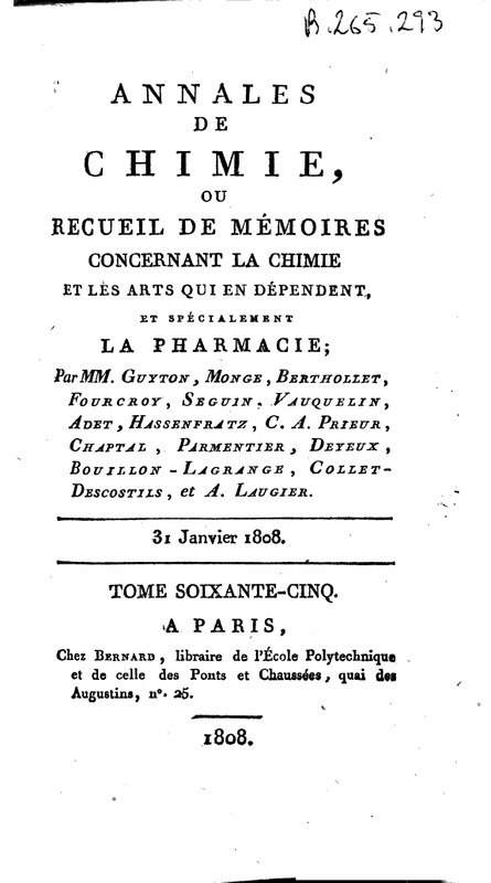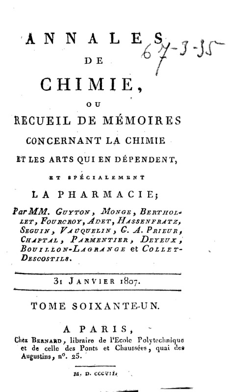 - Annales de chimie ou Recueil de mémoires concernant la chimie et les arts qui en dépendent
