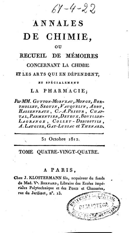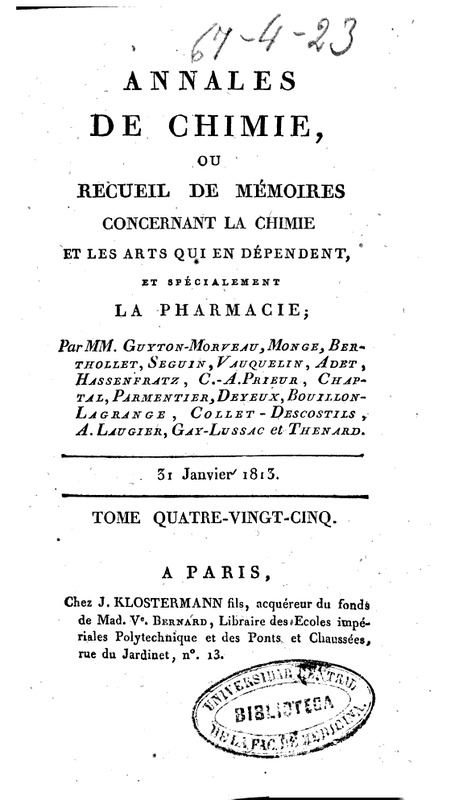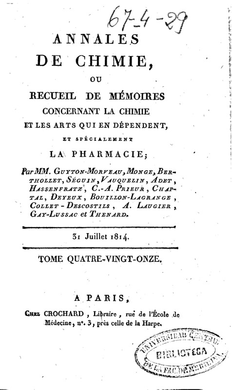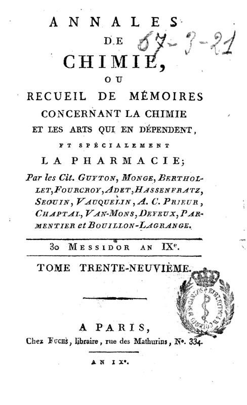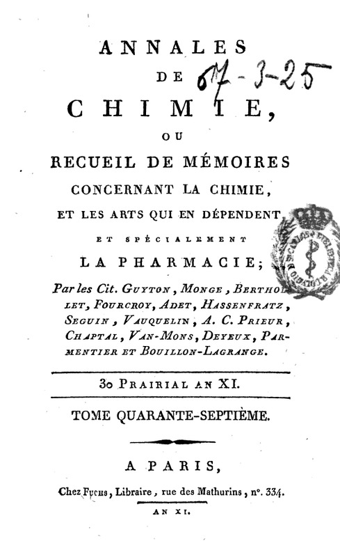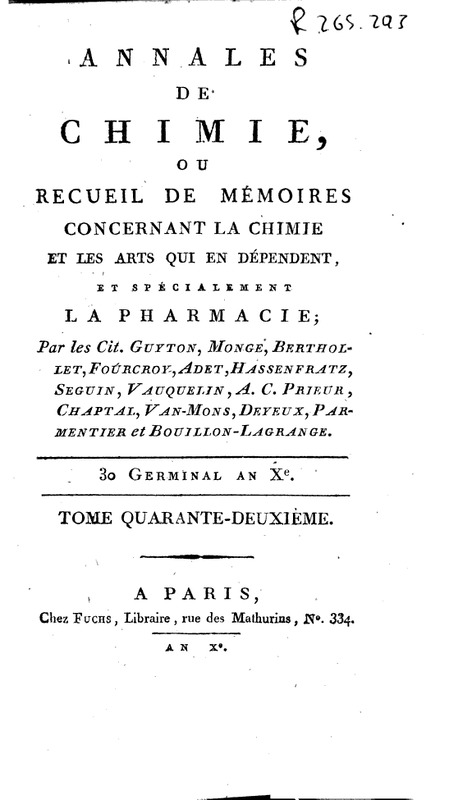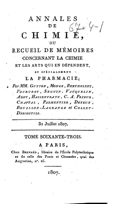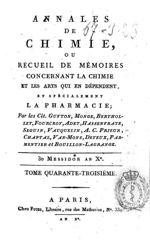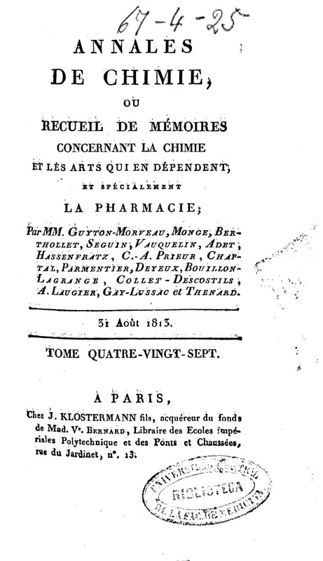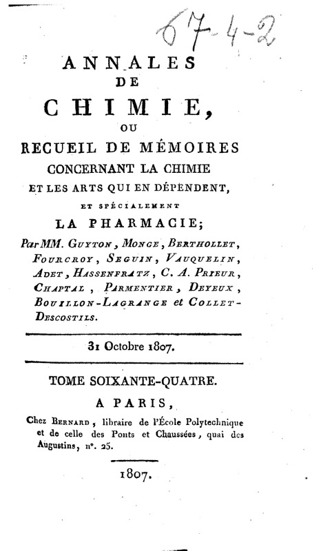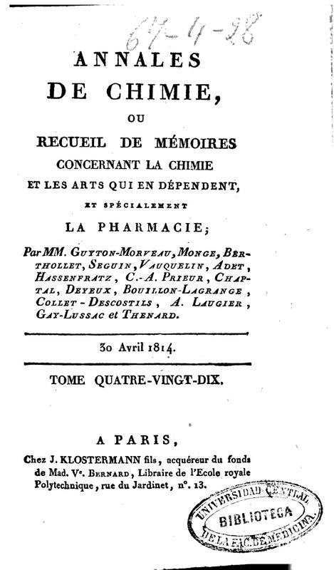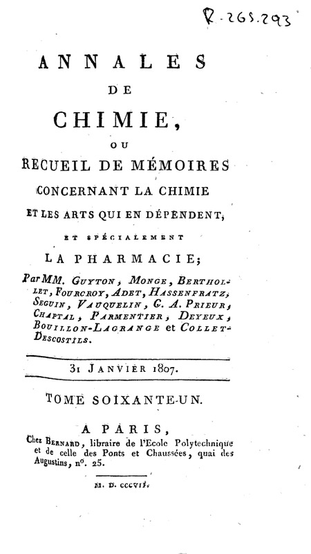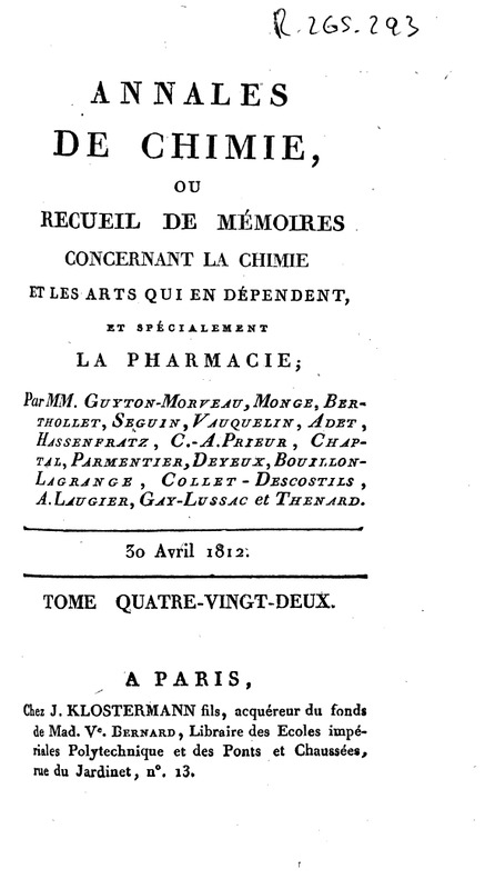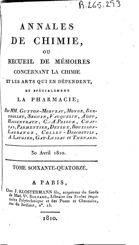 - Annales de chimie ou Recueil de mémoires concernant la chimie et les arts qui en dépendent