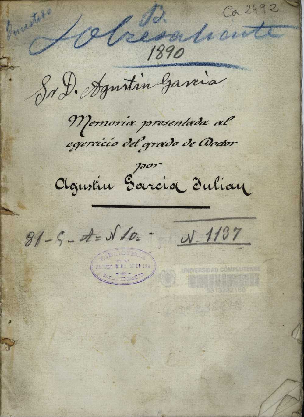 - Tesis de doctorado leída en la Universidad Central el 12 de diciembre de 1890