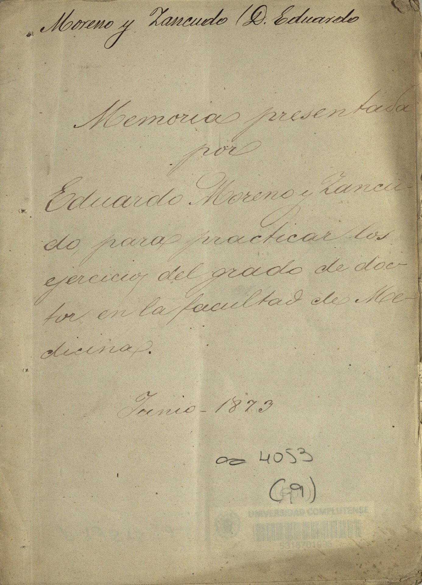 - Tesis de doctorado presentada en la Universidad Central, en junio de 1873