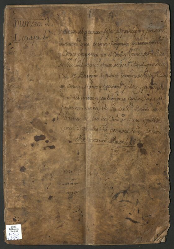 - Título tomado de la cubierta de pergamino, en la que consta: "Número 2, legajo 1. Faltan algunas fojas al principio y al fin desde instrumento…