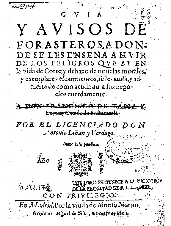 Guia y avisos de forasteros : a donde se les ensena a huir de los peligros que ay en la vida de corte y debaxo de nouelas morales ... Se les auisa ... de como acudiran a sus negocios cuerdamente