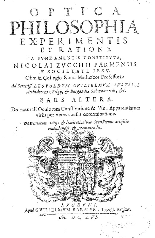 Optica philosophia experimentis et ratione a fundamentis constituta, Nicolai Zucchii ... : pars altera, De naturali oculorum constitutione & vsu apparentiarum visus per veras causas determinatione ..