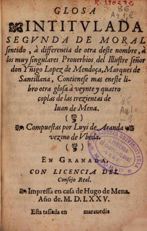 Glosa intitulada segunda de moral sentido, à differencia de otra deste nombre, à los muy singulares Prouerbios del ... señor don Yñigo Lopez de Mendoça, Marques de Santillana ; contienese mas eneste libro otra glosa à veynte y quatro coplas de las trezientas de Iuan de Mena