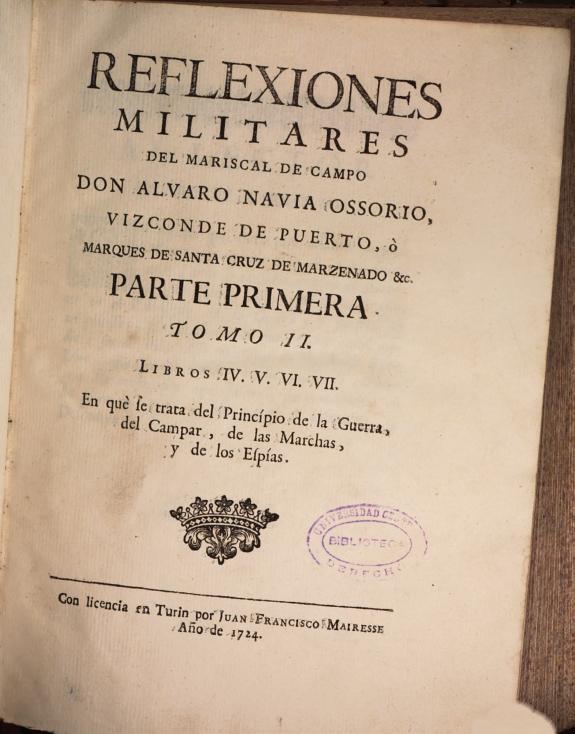 Reflexiones militares del mariscal de campo don Alvaro Navia Ossorio, vizconde de Puerto ... Parte primera, tomo II, libros IV, V, VI, VII, en què se trata del princípio de la guerra, del campar, de las marchas, y de los espías