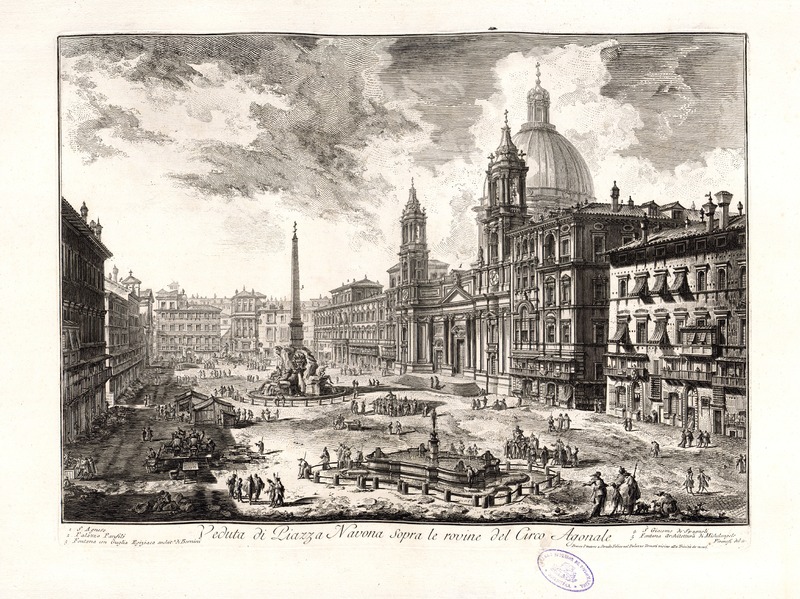 - La Iglesia de Santa Inés aparece en la parte derecha de la estampa. Hay otra estampa de Piranesi con la iglesia en la parte izquierda