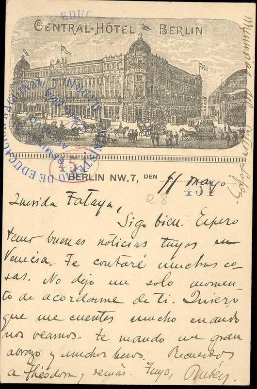 - es-ES Tarjeta postal del Central Hôtel de Berlín con la dirección "Madame Rubén Darío/ 30 Rue Feydeau/ París