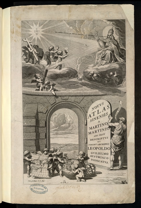Nota a la descripción física: Frontispicio calcográfico arquitectónico con una vista al fondo y, en primer término, angelotes con un mapa y un globo, rodeados de instrumentos cartográficos; en la parte superior, alegoría religiosa; en la puerta que se abre, título en latín