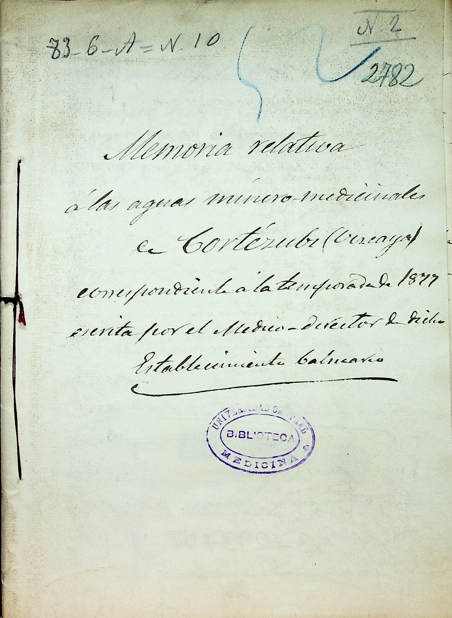 Memoria relativa á las aguas minero-medicinales de Cortézubi (Vizcaya) correspondiente á la temporada de 1877 escrita por el medico-director de dicho establecimiento balneario