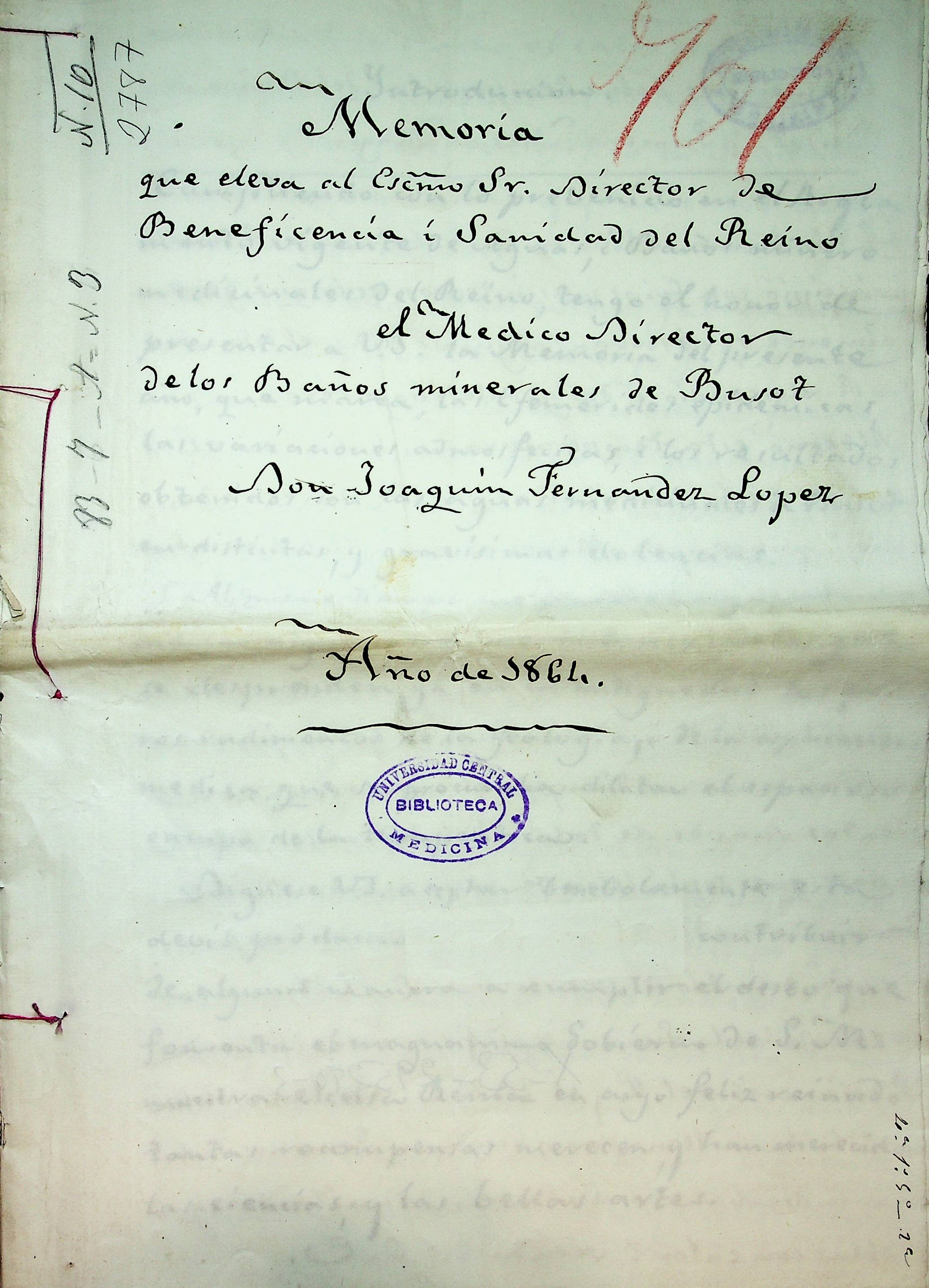 Memoria que eleva al Escmo Sr. Director de Beneficencia i Sanidad del Reino el medico director de los baños minerales de Busot D. Joaquin Fernandez Lopez, año de 1864