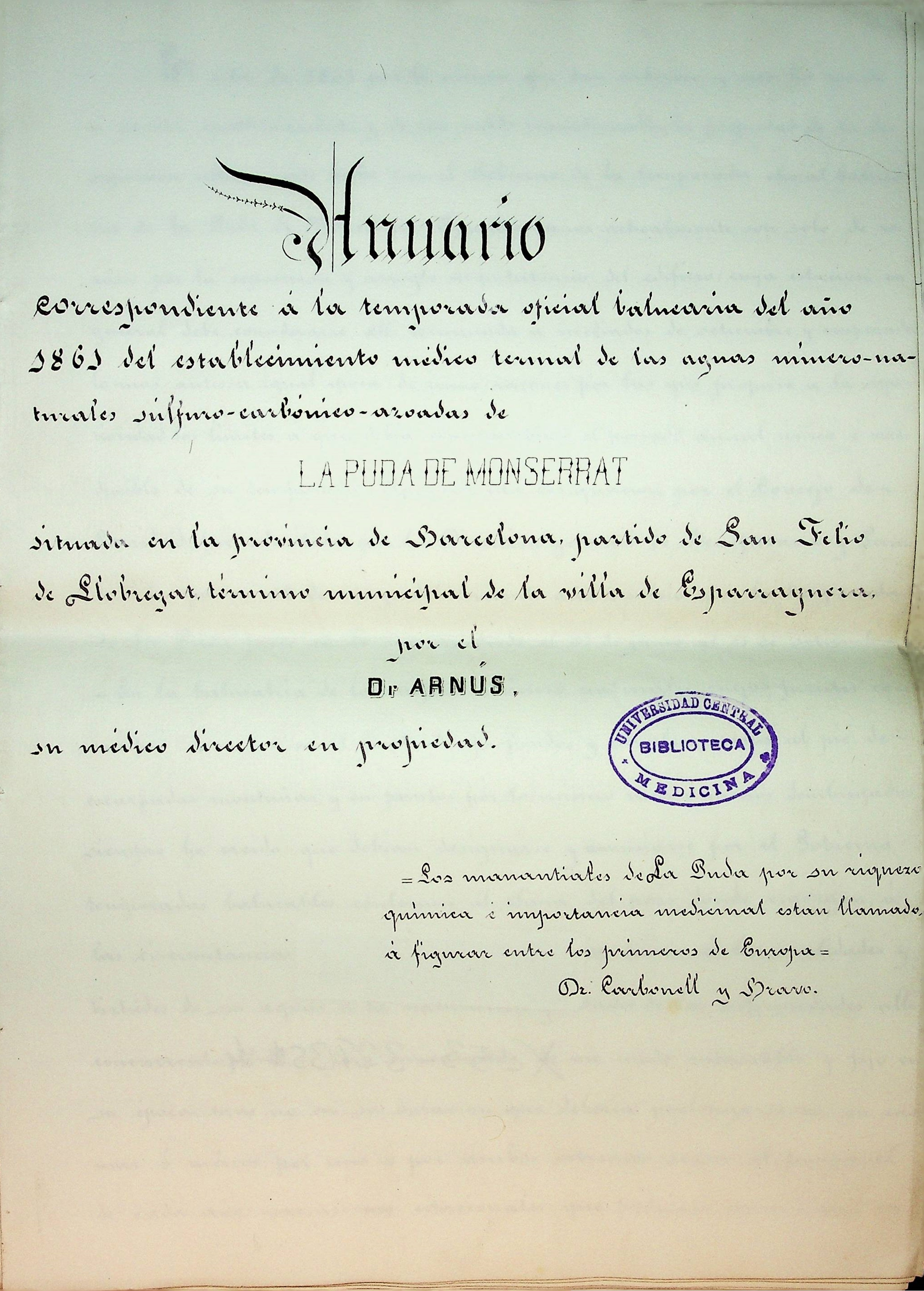 Anuario correspondiente á la temporada oficial balnearia del año 1861 del establecimiento médico termal de las aguas minero-naturales súlfuro-carbónico-azoadas de La Puda de Monserrat, situada en la provincia de Barcelona, partido de S. Feliu de Llobregat, término municipal de la villa de Esparraguera : [memoria]