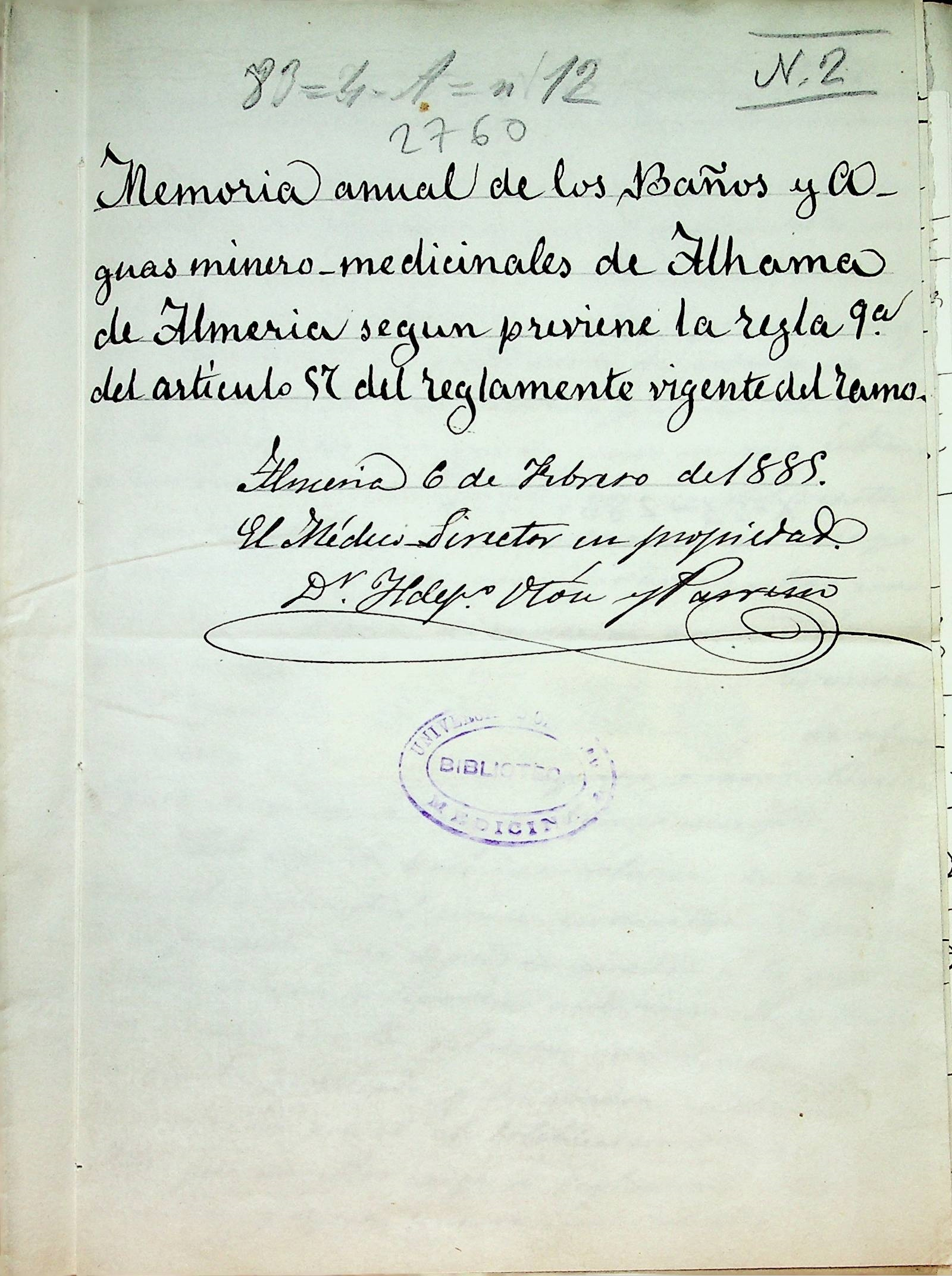 Memoria anual de los baños y aguas minero-medicinales de Alhama de Almeria segun previene la regla 9a del artículo 57 del reglamento vigente del ramo. Almeria, 6 de febrero de 1885