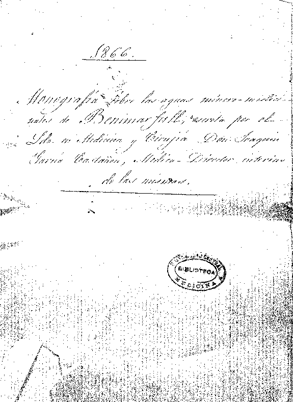 Monografia sobre las aguas minero-medicinales de Benimarfull, escrita por el Ldo. en Medicina y Cirujía Don Joaquin Garcia Castañon, Medico-Director interino de las mismas : 1866