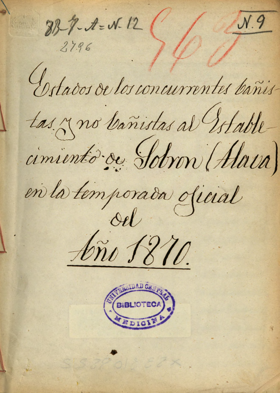 Estados de los concurrentes bañistas y no bañistas al establecimiento de Sobron (Alava)en la temporada oficial del año 1870