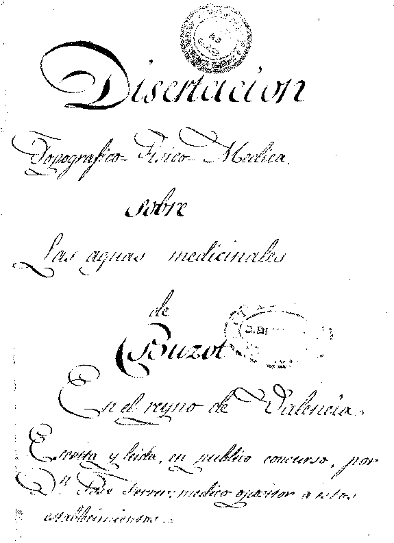 Disertacion topografico-fisico-medica sobre las aguas medicinales de Buzot (sic) en el reyno de Valencia, escrita y leida, en publico concurso, por Dn. Jose Ferrer, medico opositor á estos establecimientos