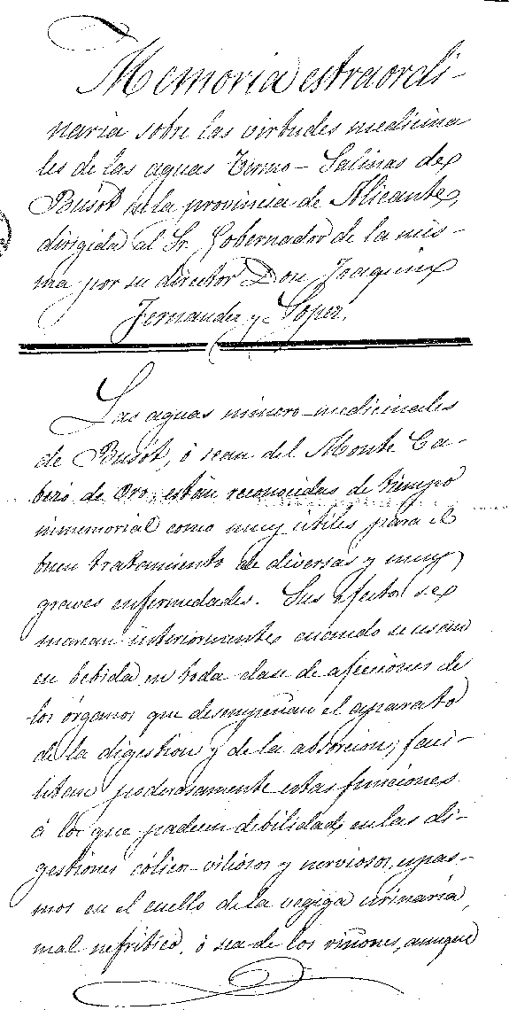 Memoria estraordinaria sobre las virtudes medicinales de las aguas Termo-Salinas de Busót en la provincia de Alicante,dirigida al Sr.Gobernador de la misma