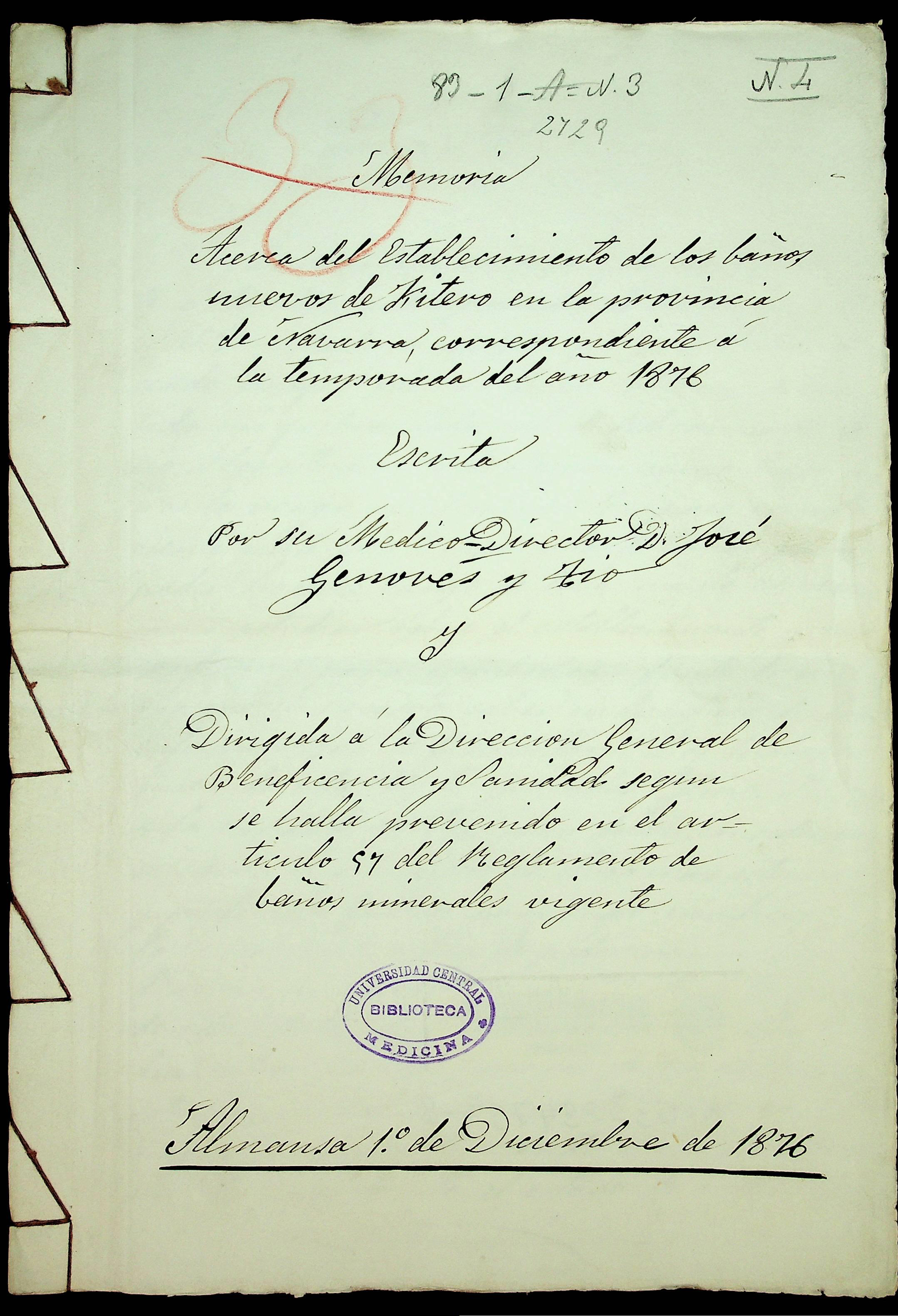 Memoria acerca del establecimiento de los baños nuevos de Fitero en la provincia de Navarra, correspondiente á la temporada del año 1876, dirigida a la Direccion General de Beneficencia y Sanidad segun..
