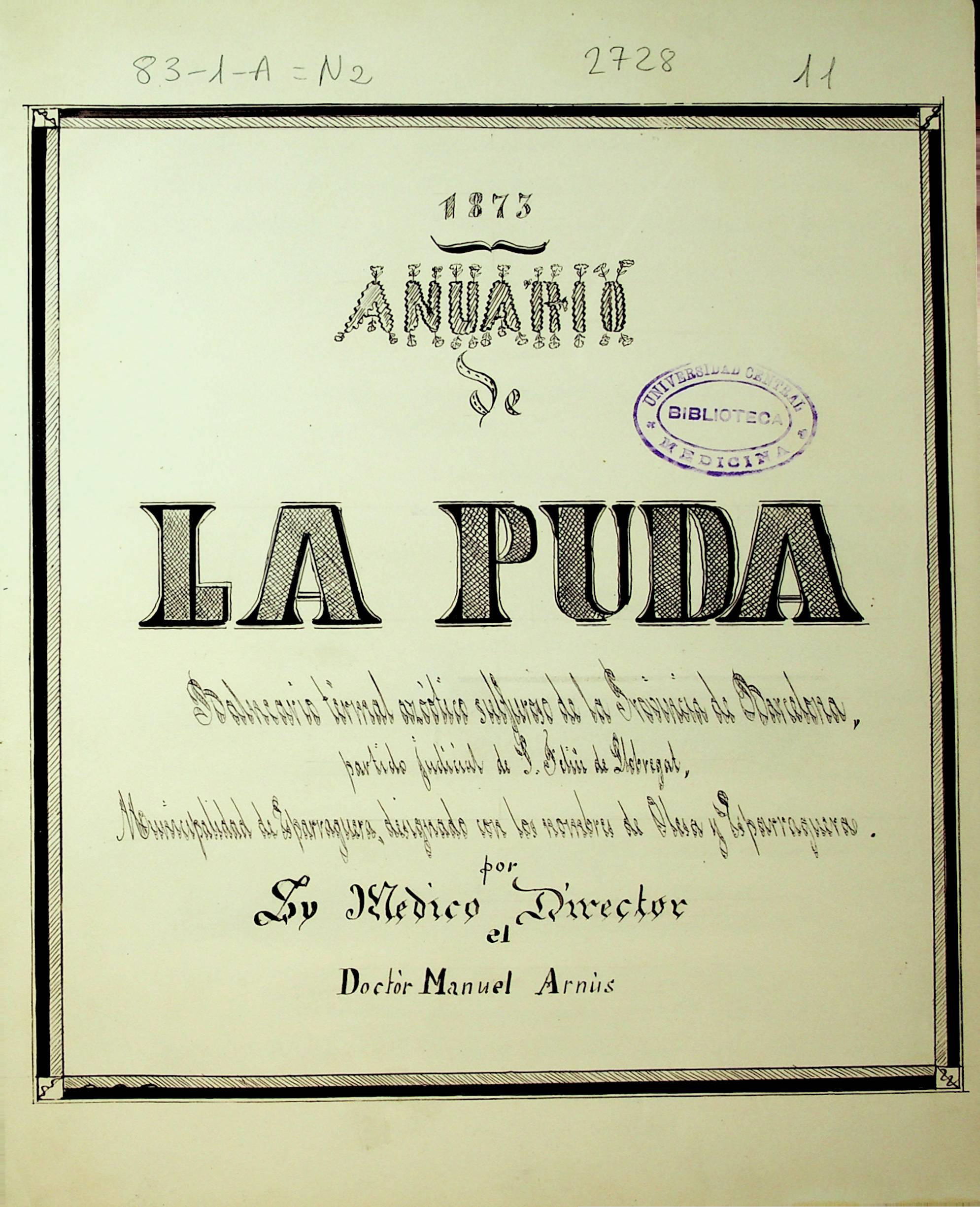 1873. Anuario de La Puda : balneario termal azótico sulfuroso de la provincia de Barcelona, partido judicial de S. Feliú de LLobregat, municipalidad de Esparraguera..