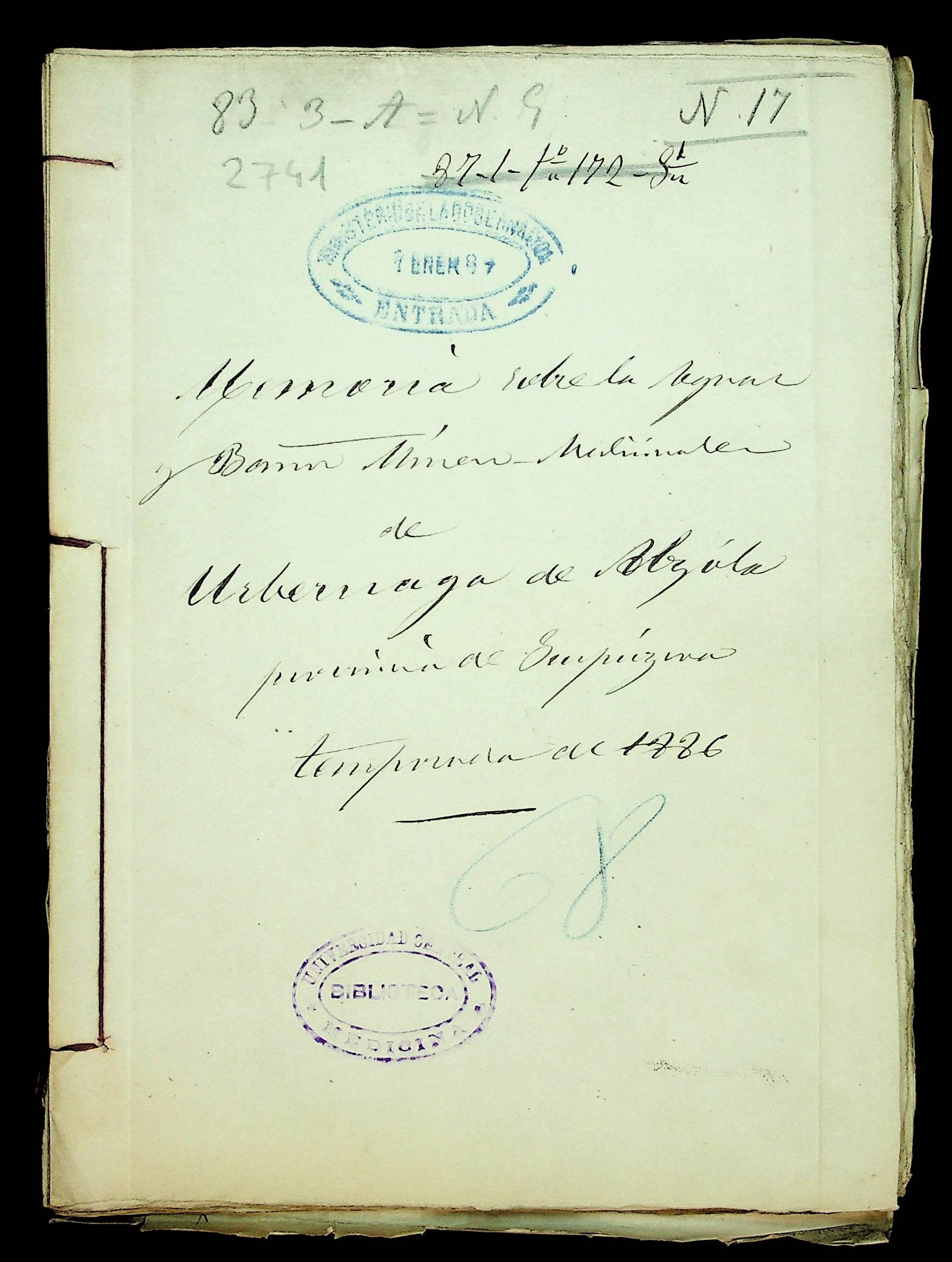 Memoria sobre las aguas y baños mínero medicinales de Urberuaga de Alzola, provincia de Guipúzcoa, temporada de 1886