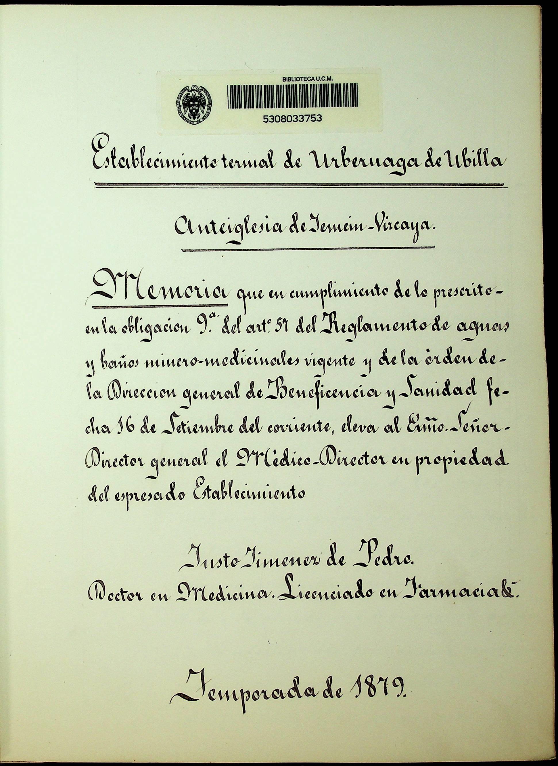 Establecimiento termal de Urberuaga de Ubilla : Anteiglesia de Jemein-Vizcaya : Memoria que en cumplimiento de lo prescrito en la obligación... : Temporada de 1879
