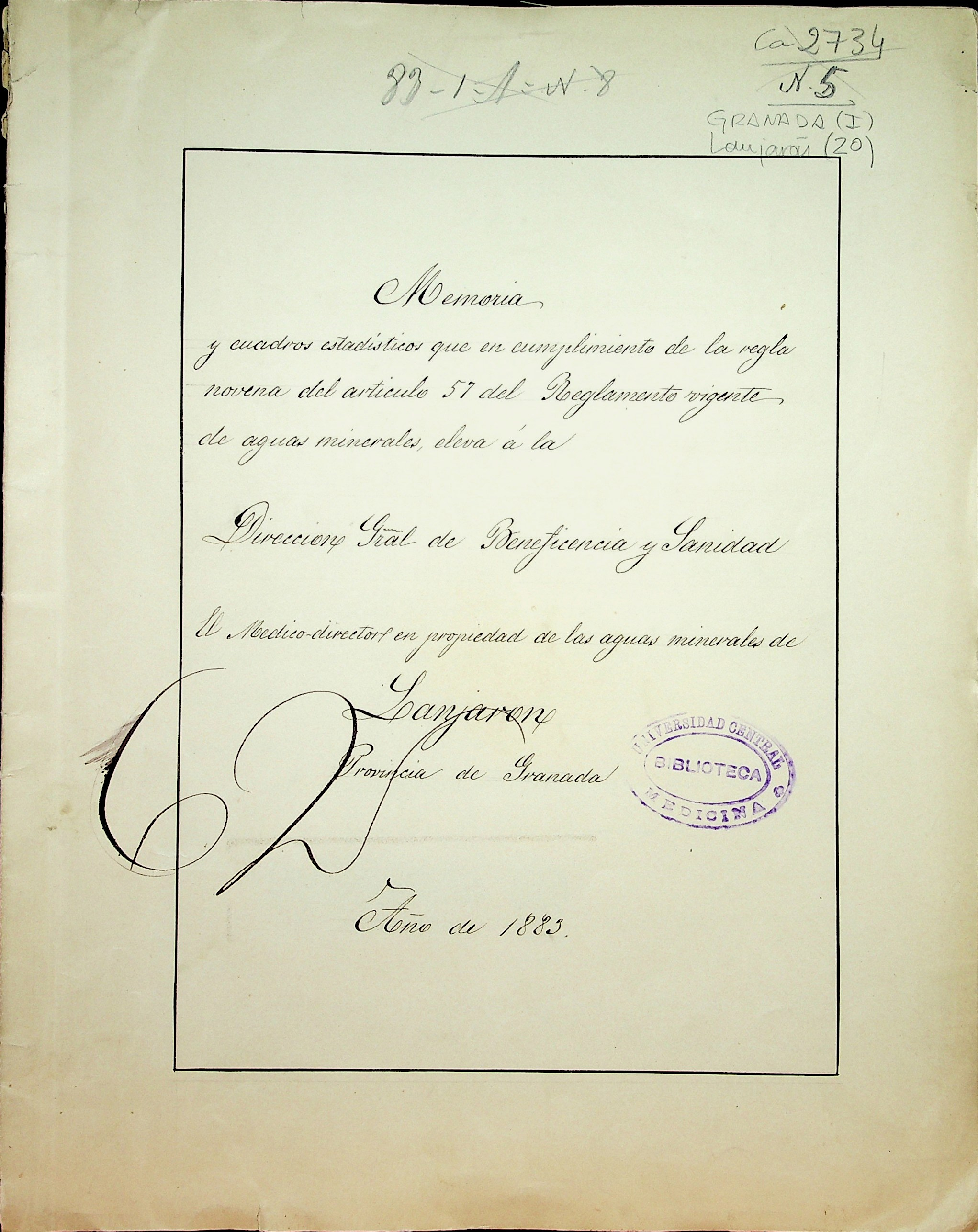 Memoria y cuadros estadísticos que en cumplimiento... del reglamento vigente de aguas minerales, eleva á la Direccion Gral de Beneficencia y Sanidad el medico-director en propiedad de las aguas minerales de Lanjarón, provincia de Granada : año de 1883, Eduardo Palomares